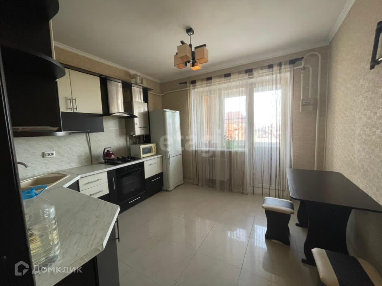 Кухня: холодильник, микроволновая печь, обеденная зона, кухонный гарнитур со встроенным духовым электрическим шкафом и газовой варочной поверхностью.
