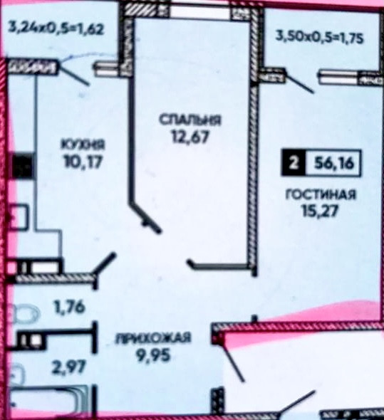 Квартира общей площадью 56,16 кв.м, эргономичной планировки: прихожая 10 кв.м, раздельный санузел, кухня-столовая 10,17 кв.м с выходом на лоджию, две изолированные комнаты, гостиная 15,27 кв.м с выходом на лоджию, спальня 12, 67 кв.м.
