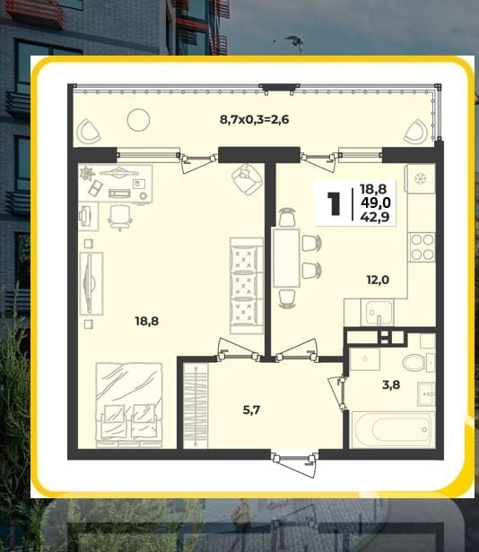 1-комнатная квартира, 49 м2, этаж 5 / 9, на продажу в Краснодаре, улица Западный Обход, 42к6