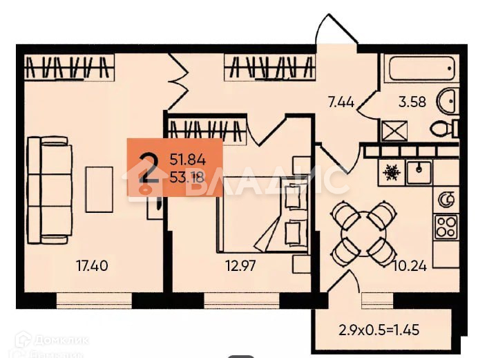 Общая площадь 52 м2