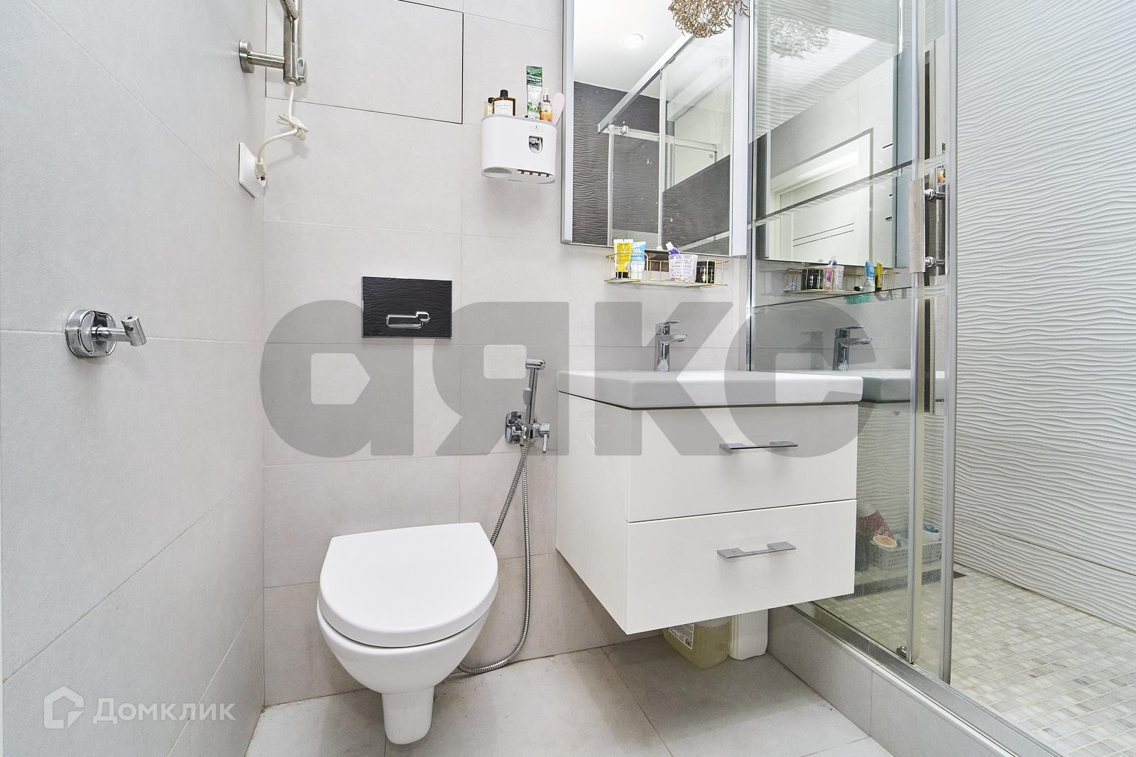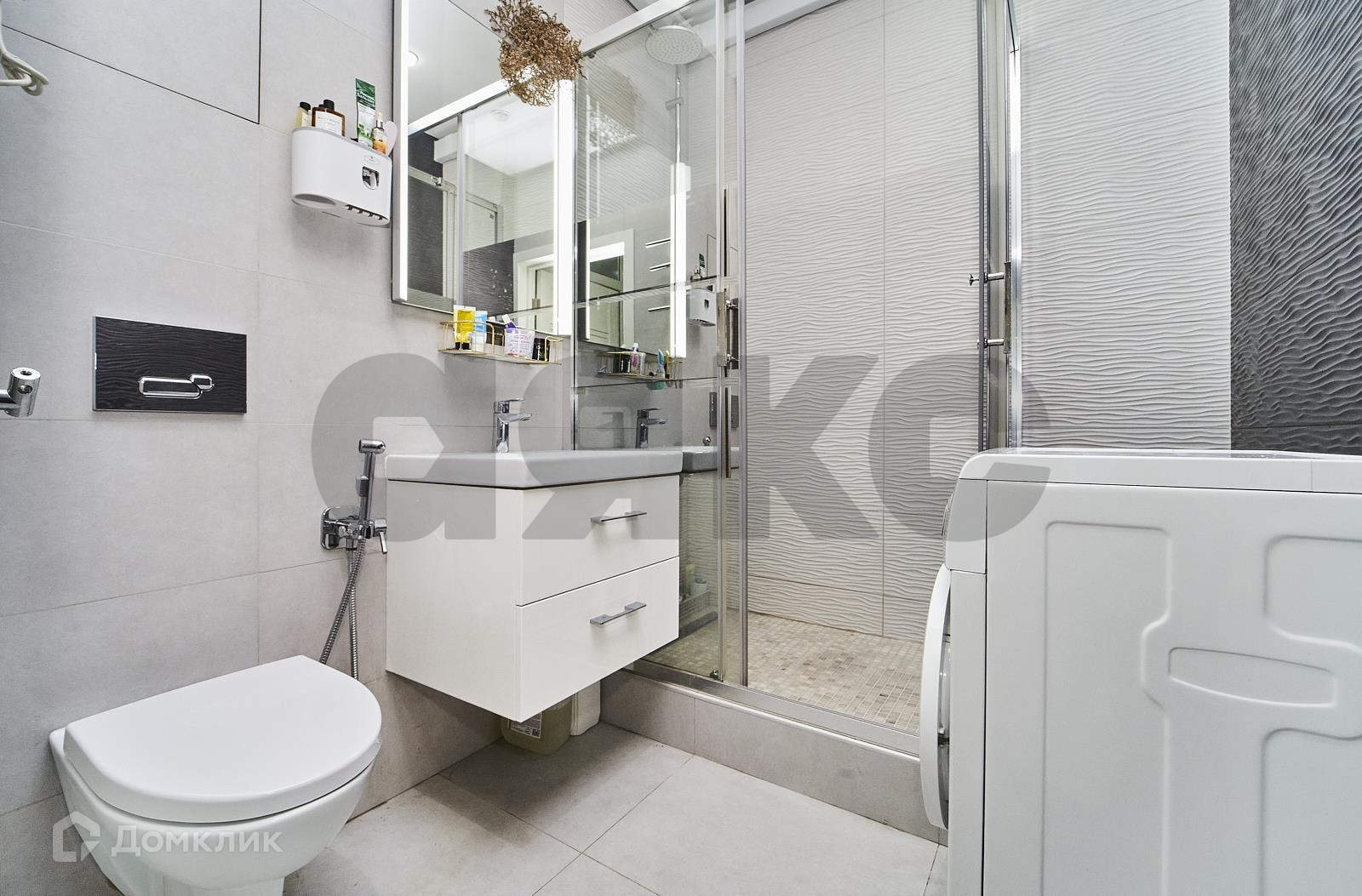 В санузле возле инсталляции унитаза гигиенический душ, раковина с тумбой, современная стеклянная душевая кабина, а также стиральная машина.
