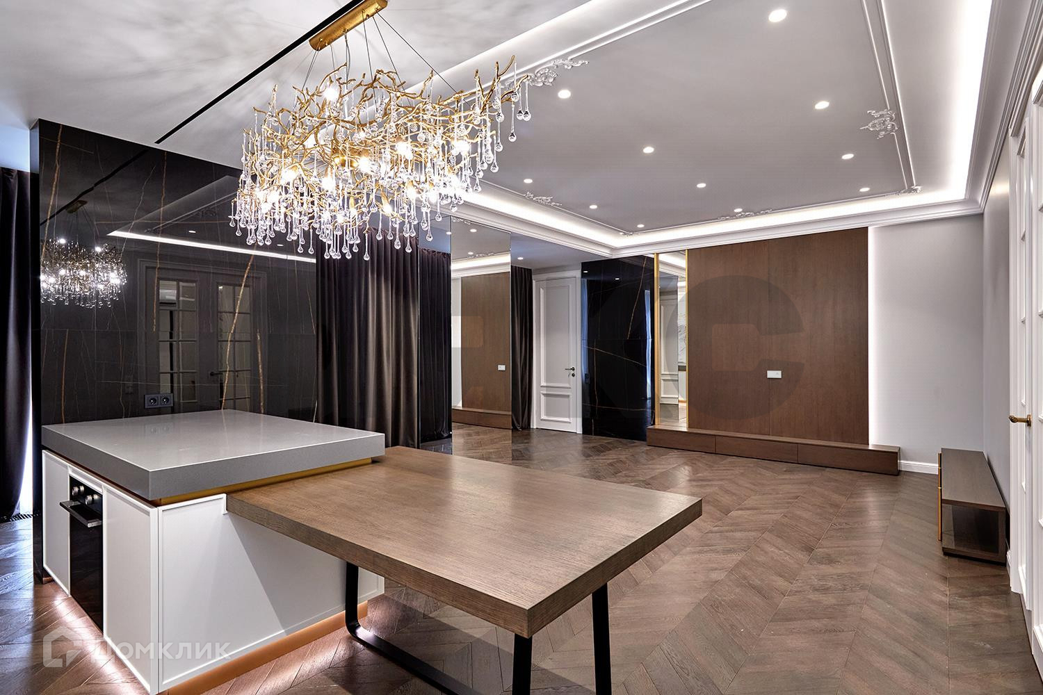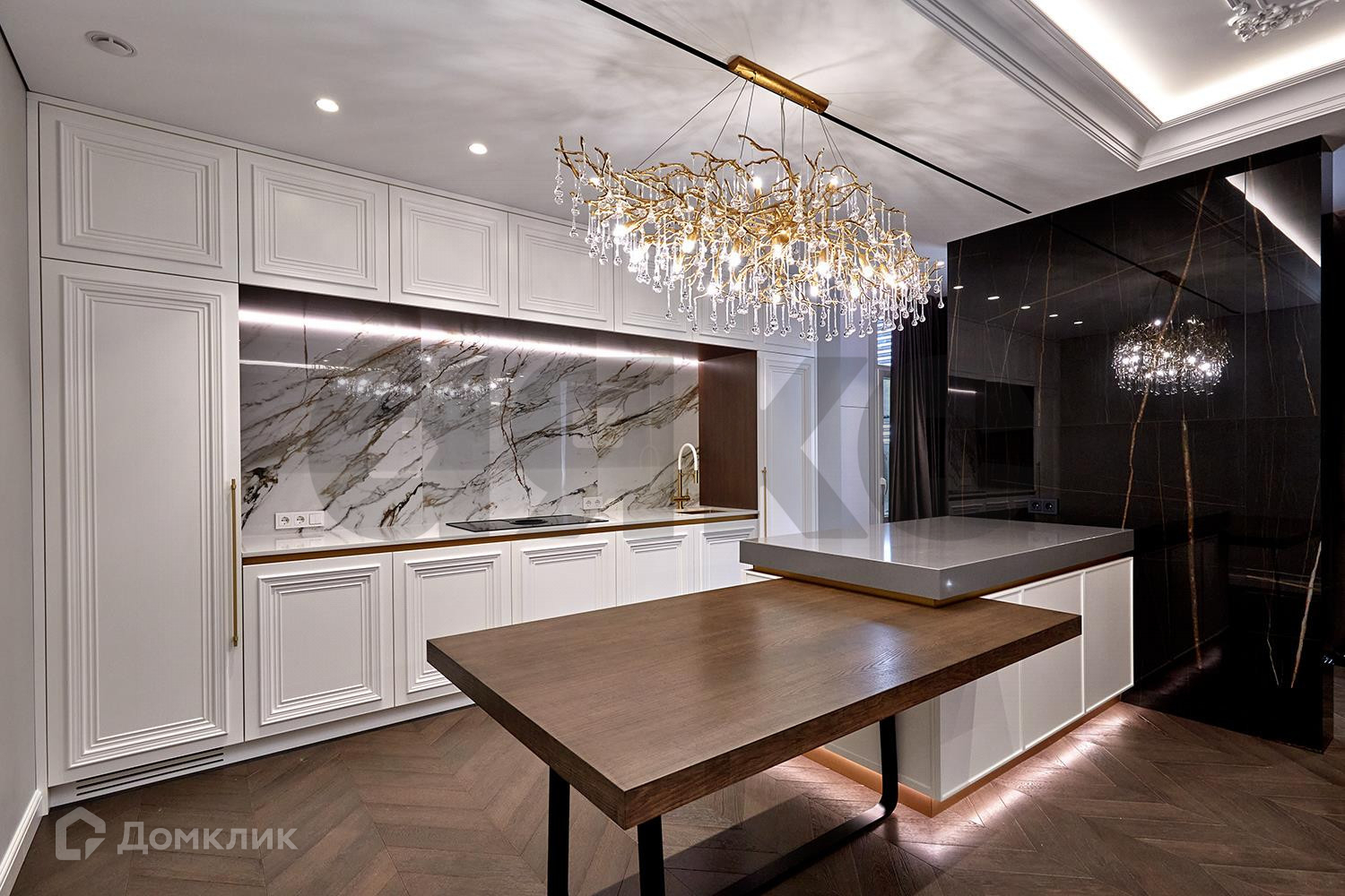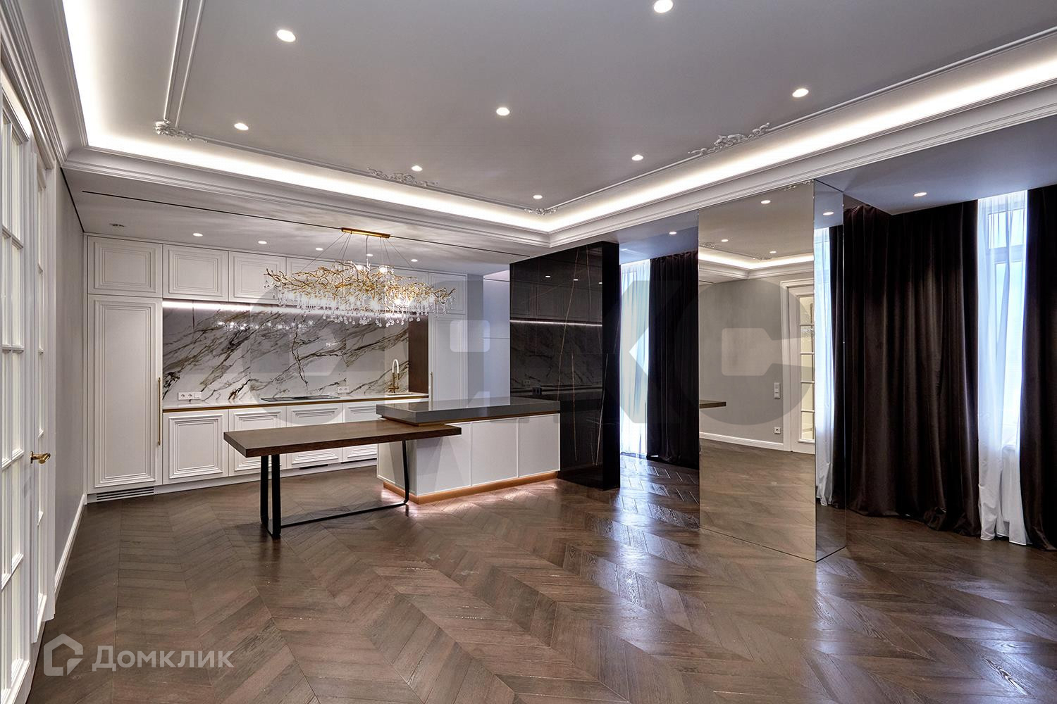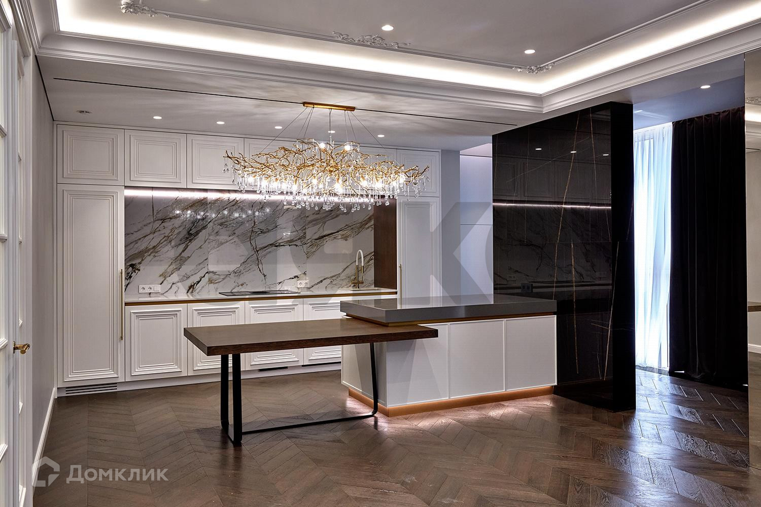 Кухня и гостиная объединены в общую зону, кухня изготовлена по индивидуальному проекту, полностью укомплектована техникой шведской фабрики ASCO (холодильник и духовой шкаф с функцией пароконвектомата) варочная панель со встроенной вытяжкой ELICA Nikolatesla