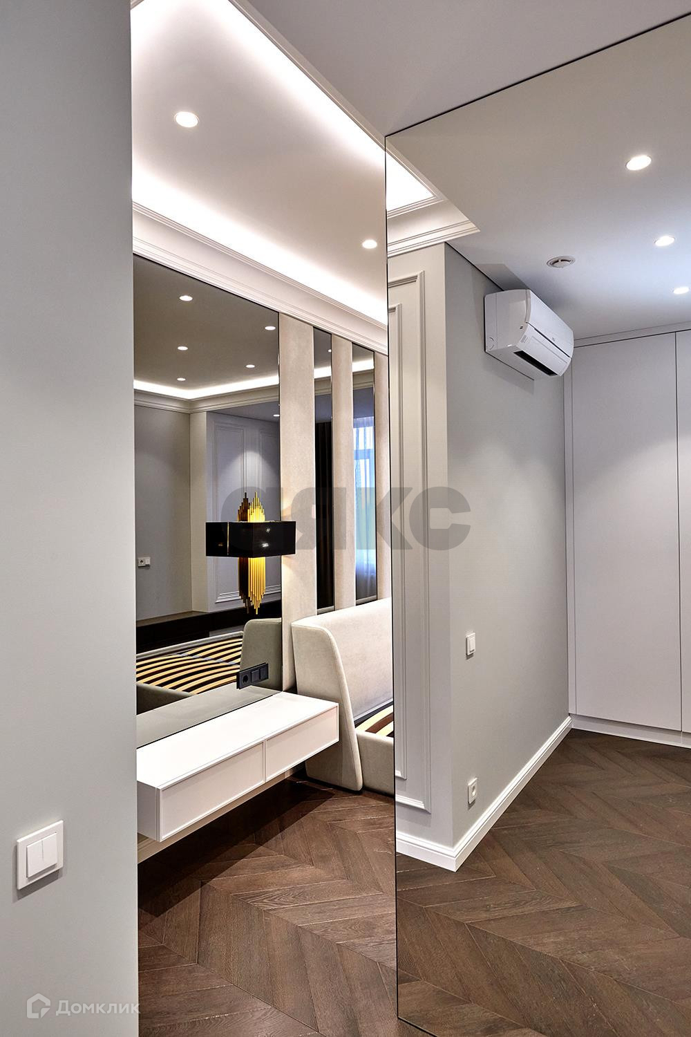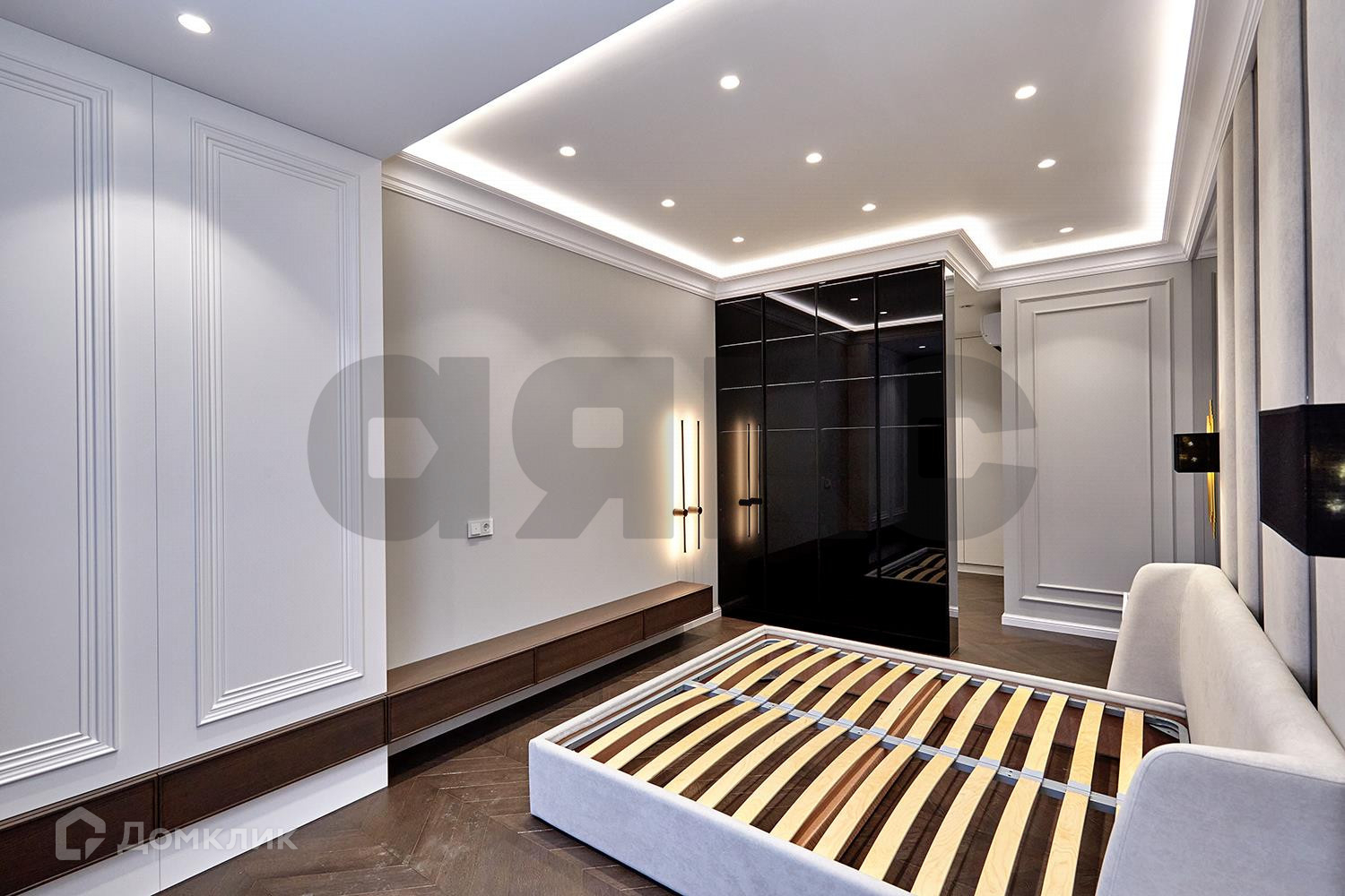 Спальня совмещена с гардеробной комнатой, с продуманной до мелочей системой хранения, так же есть высокая витрина с подсветкой для хранения сумок и аксессуаров. Кровать с ортопедическим основанием, размер спального места 180/200