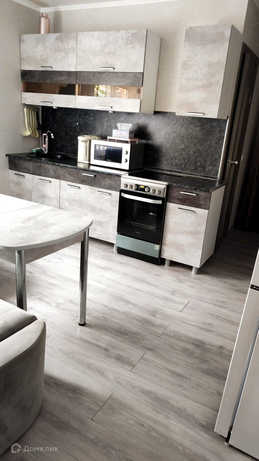 В квартире качественный современный ремонт в серых тонах. Большие окна в комнате и кухне - в квартире светло, тепло, просторно. При входе широкая зона под шкаф, большой санузел. Кухня и комната правильной формы, в комнате спокойно расположились диван, телевизор, большой обеденный стол. Для покупателя оставляем всё необходимое, включая стиралку, стол, диваны, шкафы!