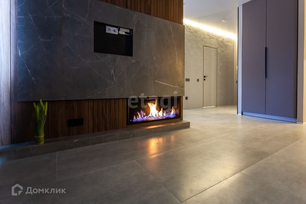 По всей квартире установлен электрический теплый пол,на полу крупноформатный керамогранит, обои с эффектом выкрашенных стен,дверь скрытого монтажа в ванную комнату, так же установлены различные декоративные элементы такие как каменные панели с имитацией природного камня сланца , подсветка некоторых примыканий между стенами и потолком, парящий потолок .