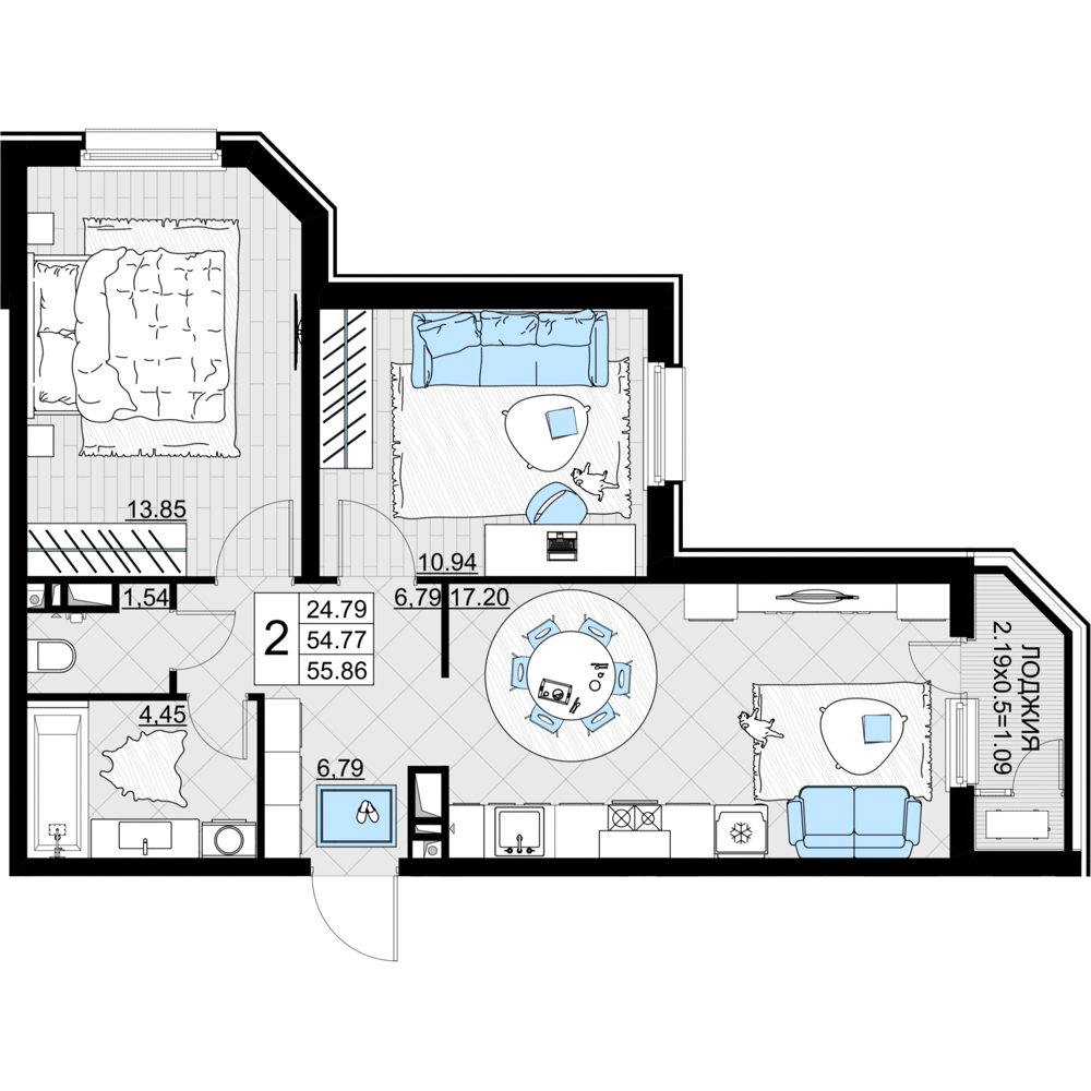 Общая площадь 55.86 м2