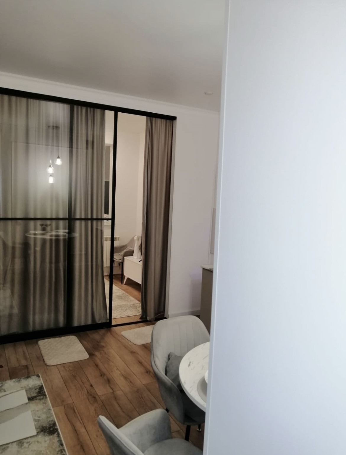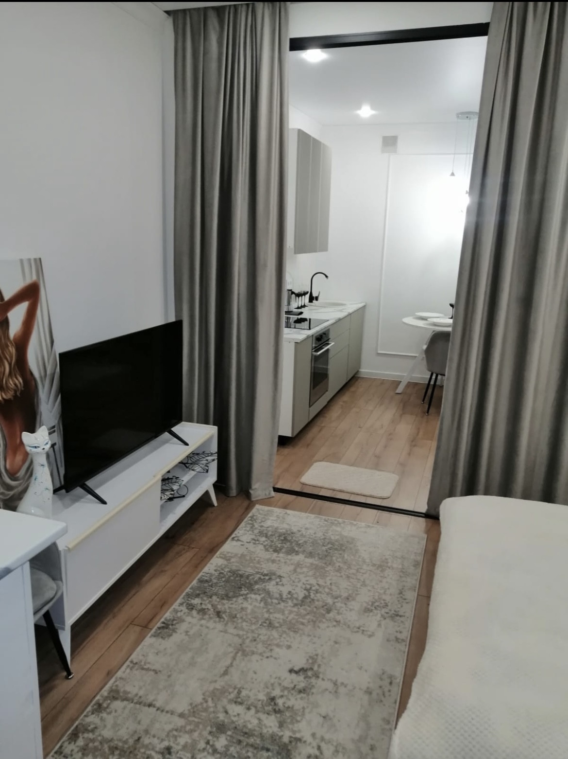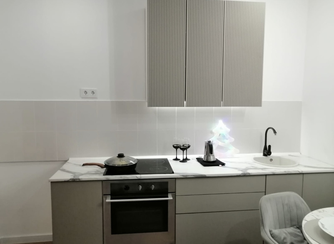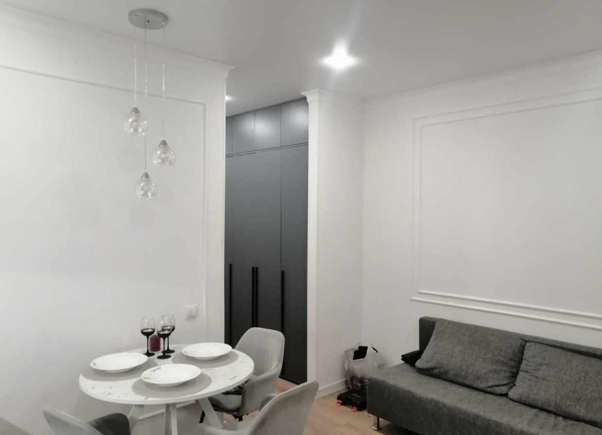 Сделан современный, лаконичный ремонт. Спокойная цветовая гамма. Выделены зоны спальни и гостиной - 10 и 12 м. кв. соответственно.