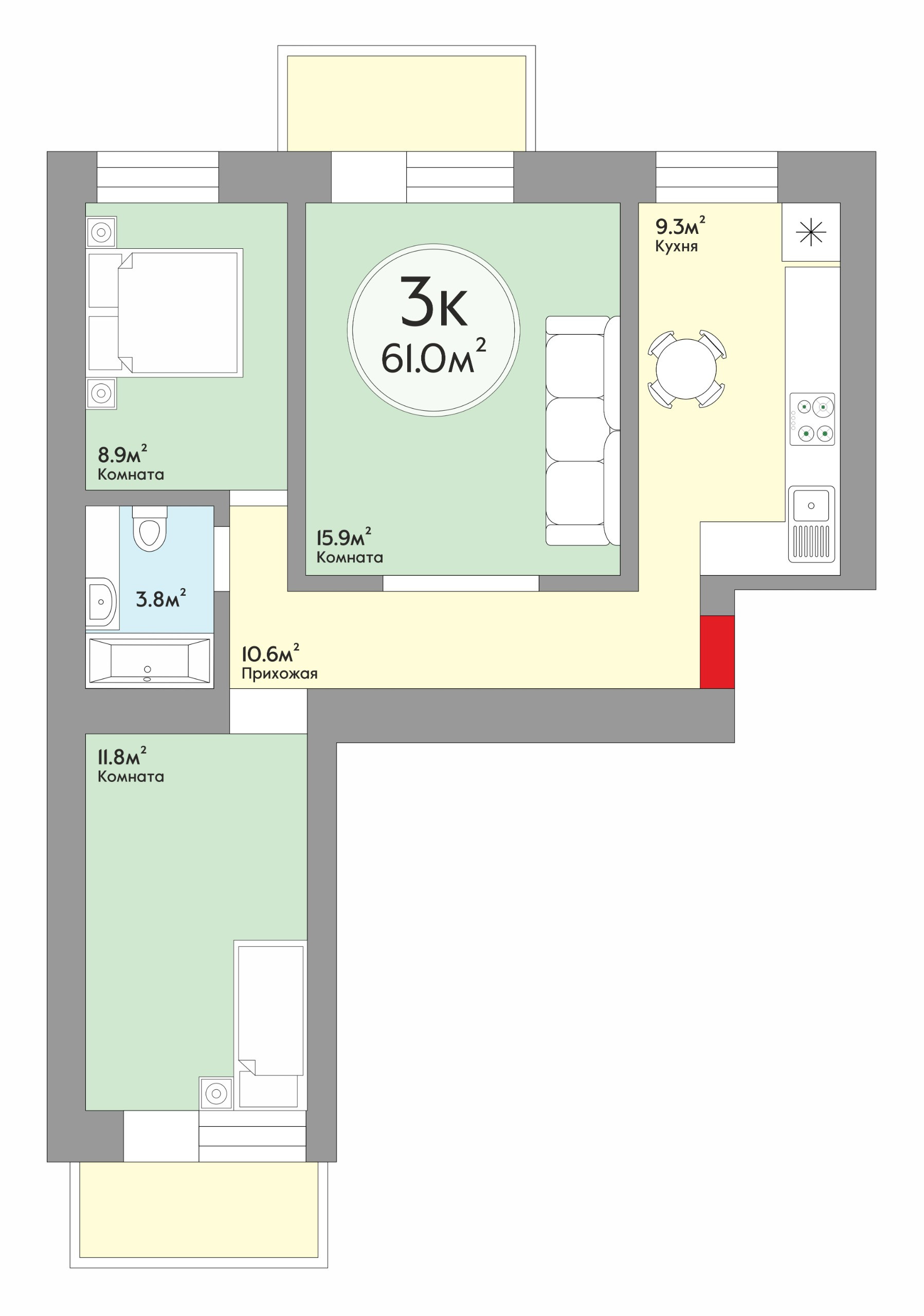 Общая площадь 61 м2