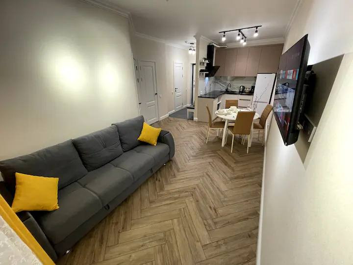 В квартире просторная комната, с большими окнами, которые обеспечивают отличное естественное освещение. В комнате имеется достаточно места для размещения кровати, шкафа и стола для работы или обеда. Помимо комнаты, квартира также включает в себя отдельную кухню. Кухня оснащена всей необходимой бытовой техникой, такой как холодильник, плита, микроволновая печь и стиральная машина. Ванная комната современного дизайна, включает в себя душевую кабину, умывальник и туалет.