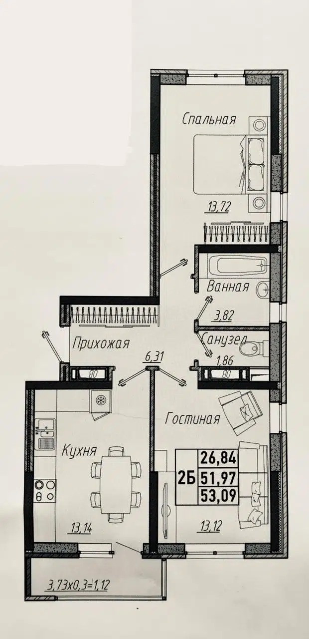 Общая площадь 53 м2