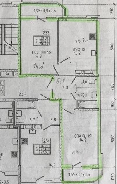 Общая площадь 56.5 м2