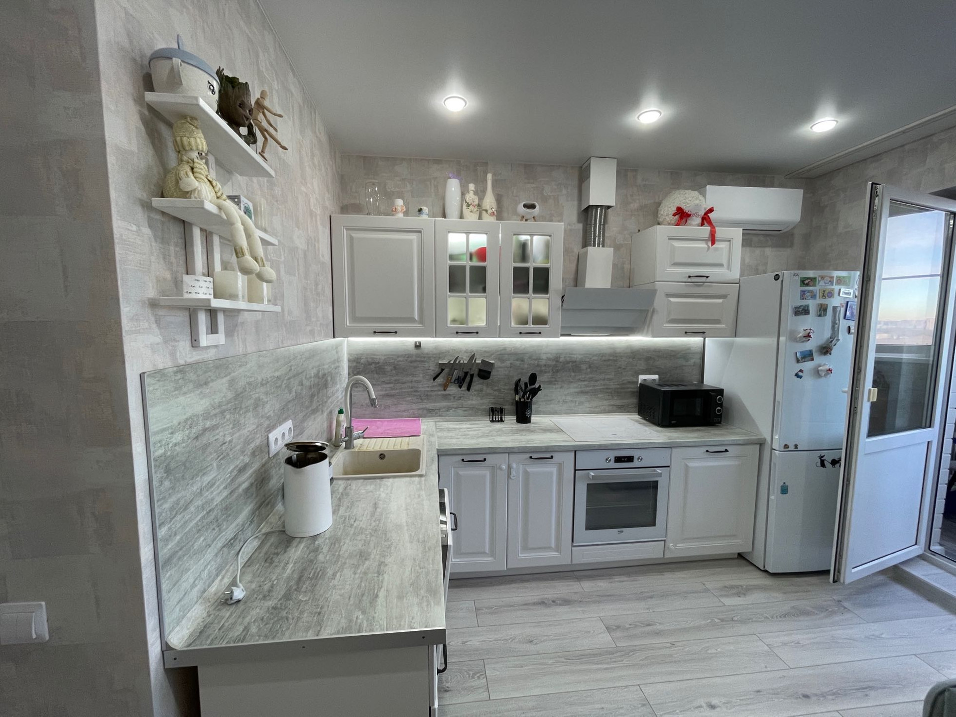 Освещение на кухне в 6 точках, есть подсветка под навесными шкафами (от стены до холодильника).