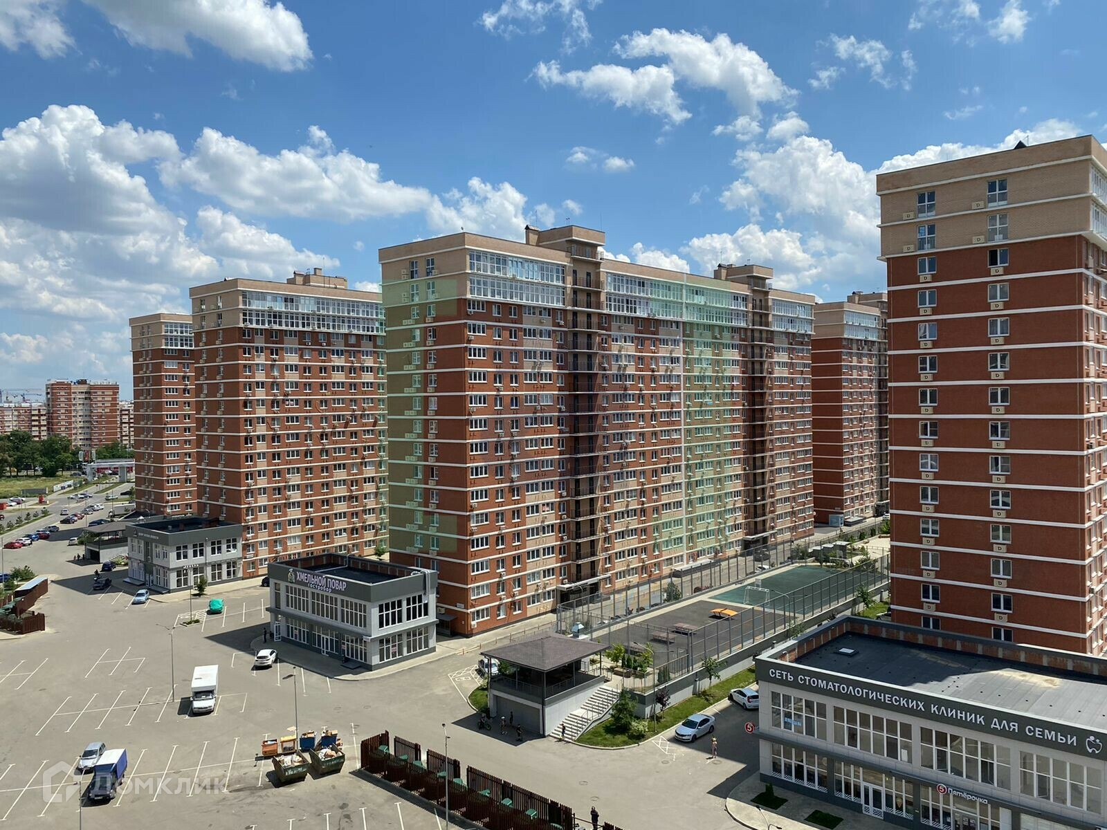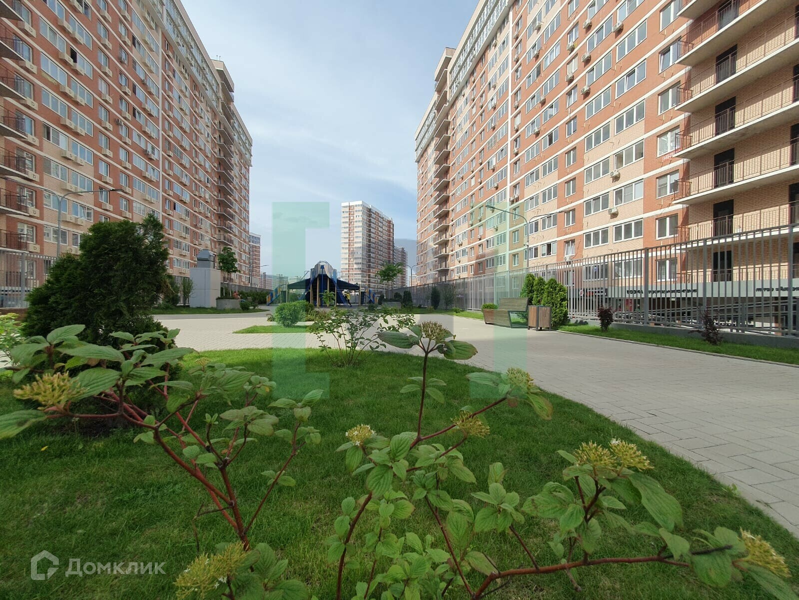 Придомовая территория: комплексное озеленение и благоустройство, фонтан в центре комплекса, футбольное и баскетбольное поля, детские площадки, тренажеры и велодорожки по всей территории комплекса.