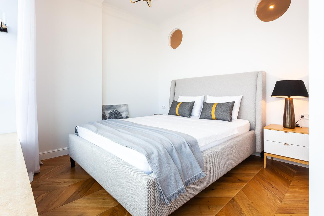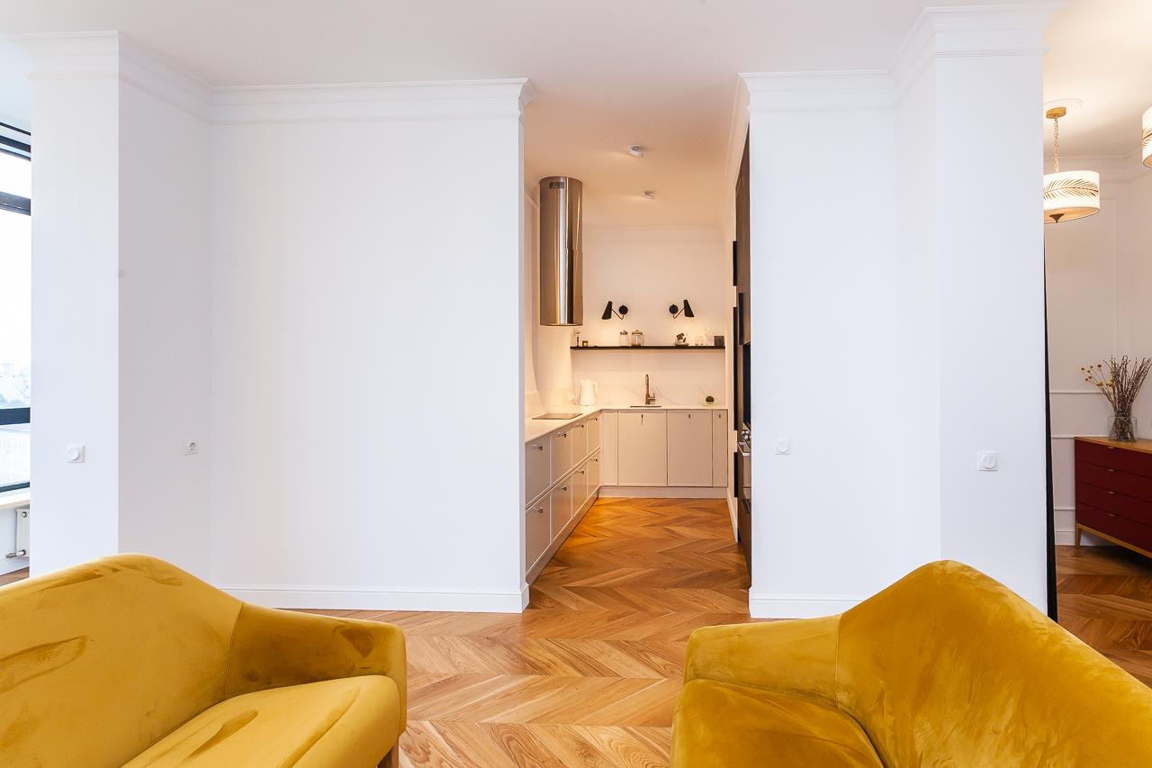 Ремонт выполнен из современных, качественных материалов: на полу паркетная доска из дуба в раскладке французская ёлочка, мраморный подоконник (0,4*6,5 м) Египетский «Атлантида», стеновая панель (2*2,5 м) для TV-зоны так же из мрамора, в ванной керамогранит KERAMA MARAZZI, потолки - гипсокартон в один уровень, 3 м в чистом виде (изначально были 3,2 м), двери INVISIBLE (система скрытого монтажа).