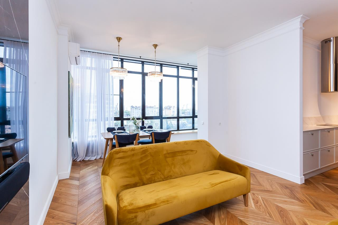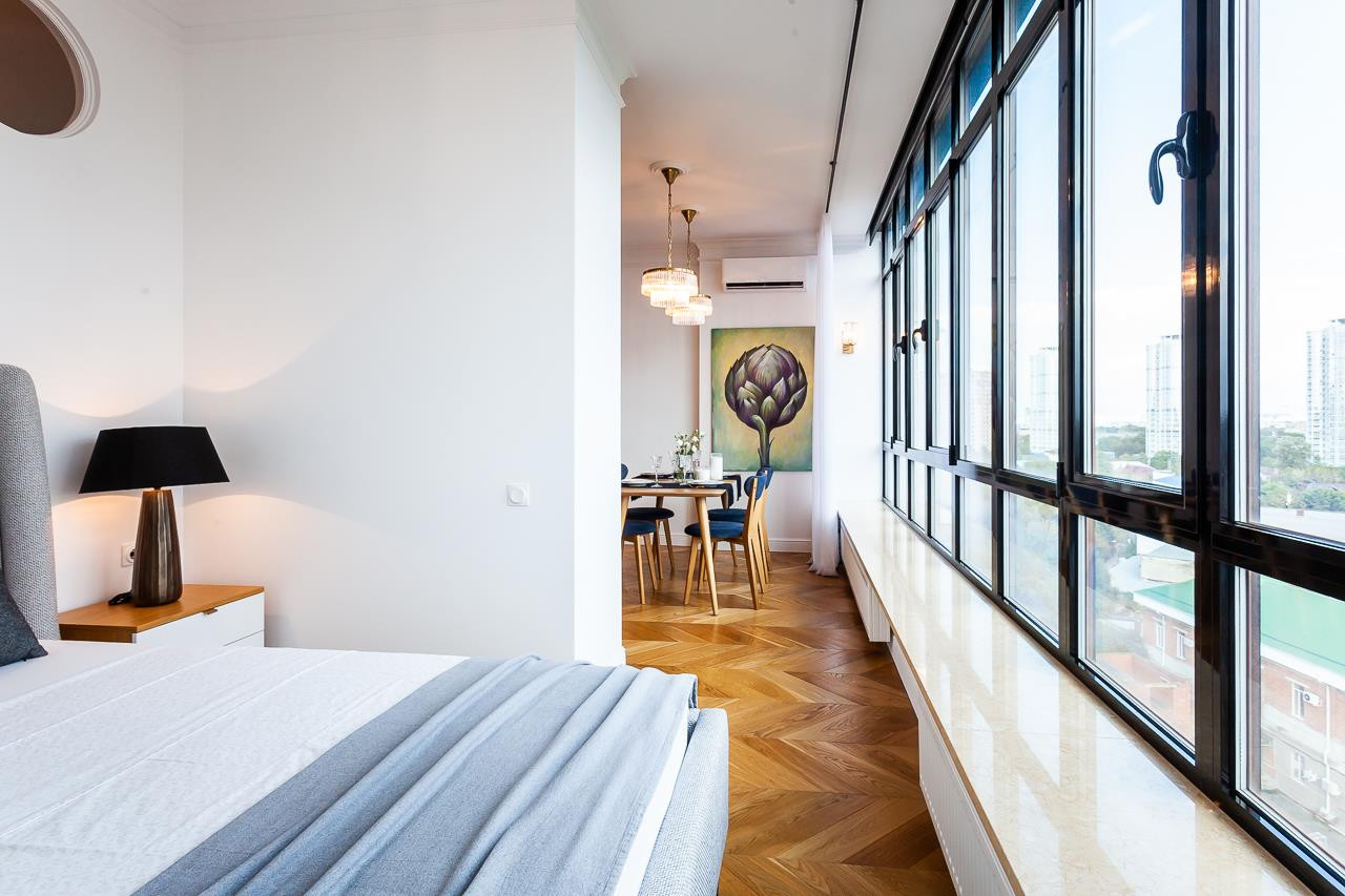 Изюминкой данной квартиры являются французские окна, установленные по всей ширине квартиры (6,5 метров!), из которых открывается великолепный вид на город. Окна - алюминиевый профиль с напылением от солнца, двухкамерный стеклопакет ALUTECH. По всей длине установлены радиаторы датской фирмы DANFOSS.