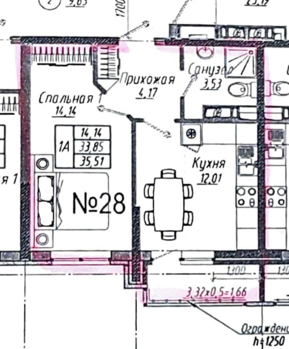 Общая площадь 35,5 кв.м,жилая площадь 14,1 кв.м.Предчистовая отделка.