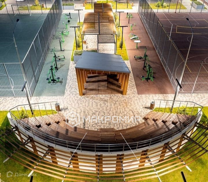Во дворе футбольное и баскетбольное поле, детские площадки, тренажеры и велодорожки. Также  собственный амфитеатр и места отдыха с возможностью подключения к Wi-Fi. А уникальной особенностью комплекса является сквер «Аллея Славы» с зонами отдыха, фонтаном и скульптурами.