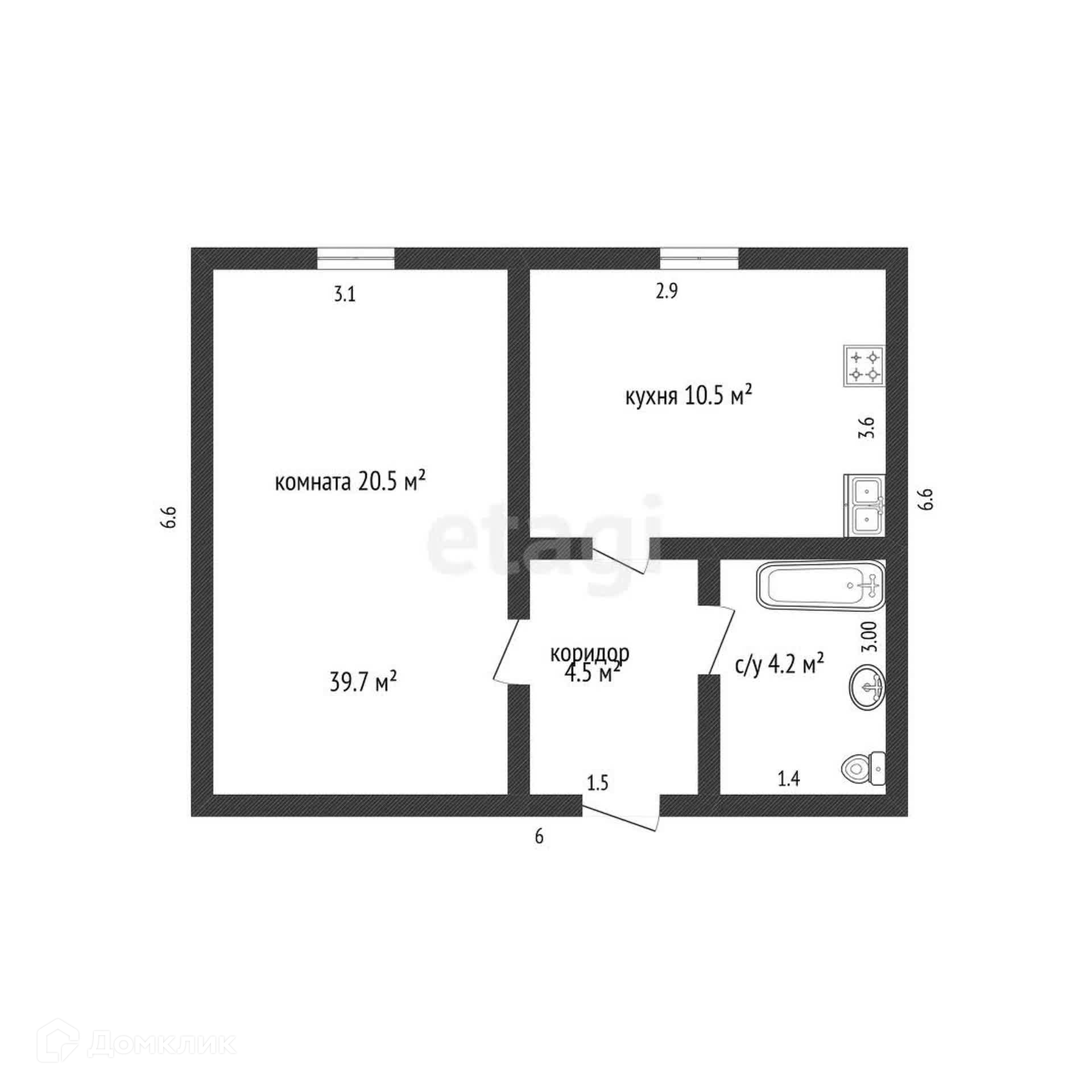 Общая площадь 39.7 м2