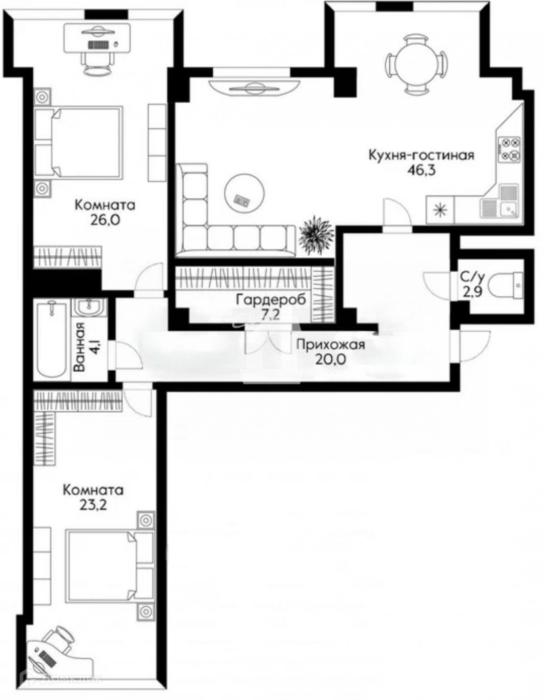 - площадь кухни-гостиной 46,3 кв.м., две изолированные комнаты 26 и 23 кв.м., гардеробная комната 7,2 кв.м.