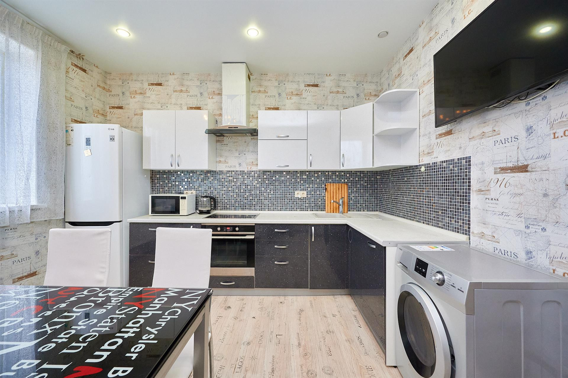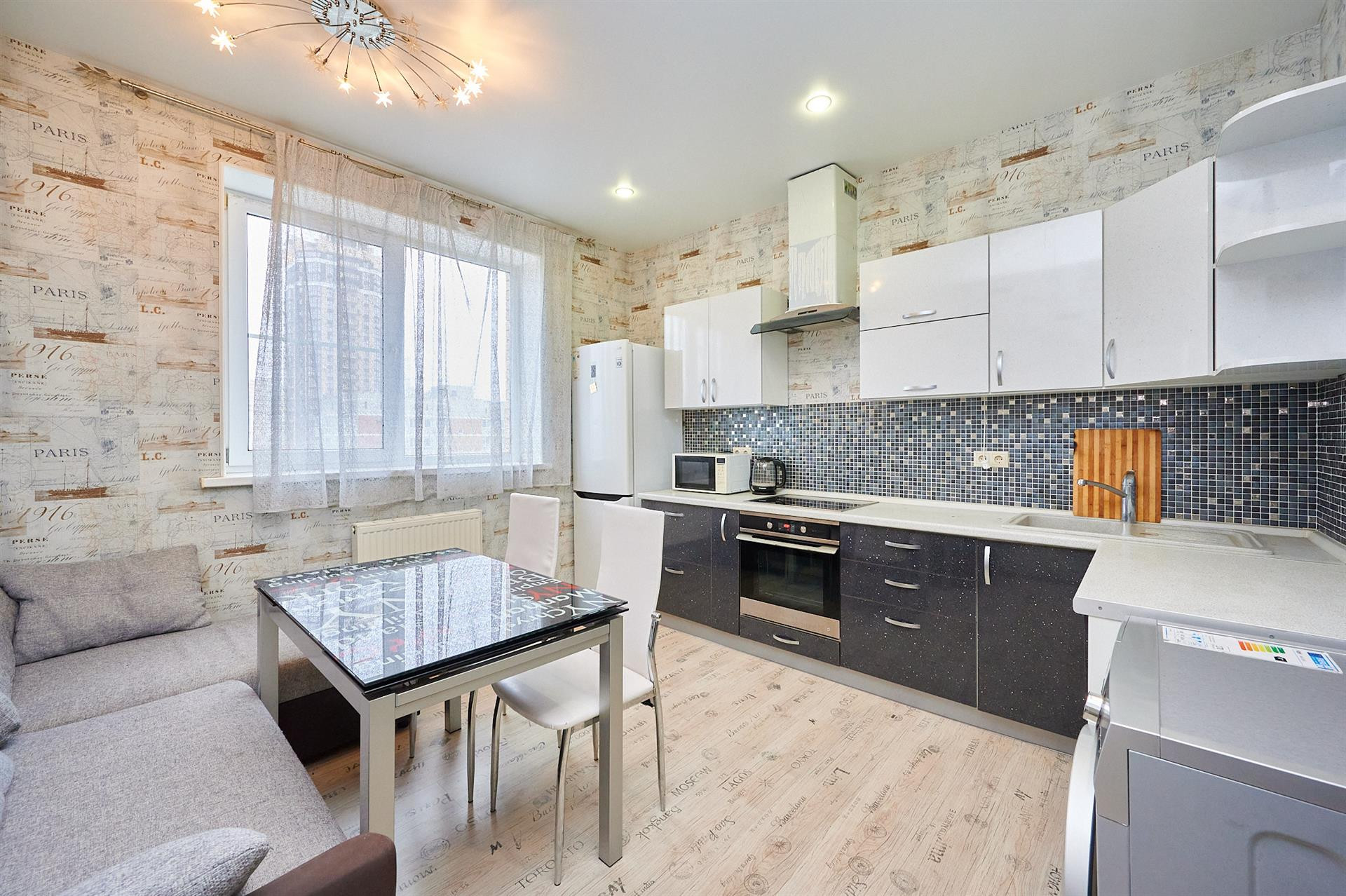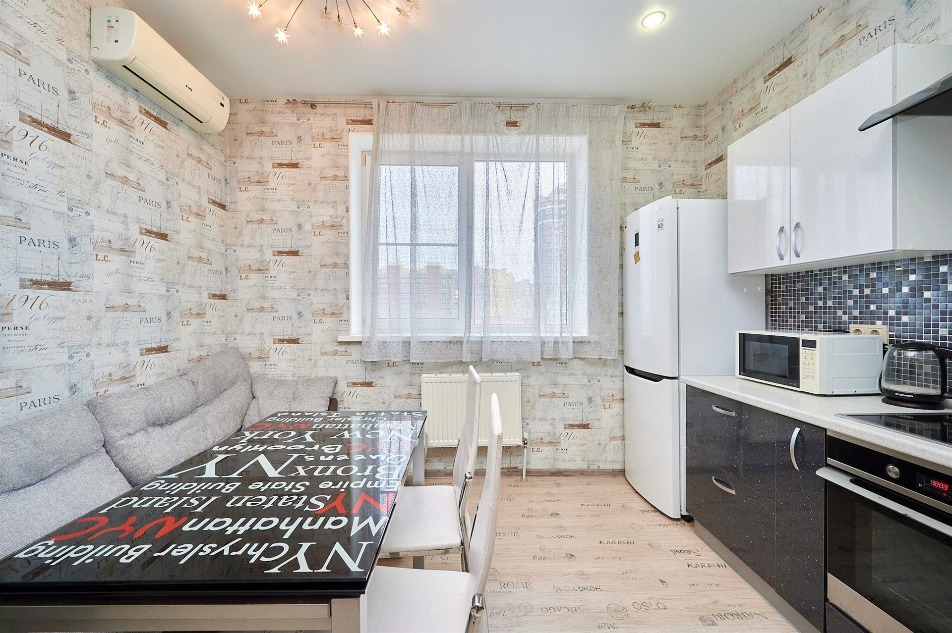В квартире выполнен ремонт (натяжные потолки, ламинат на полу) и есть абсолютно все для жизни, а именно: пластиковые окна, застекленная лоджия, металлическая входная дверь, две сплит системы, телевизор, посудомоечная машина, холодильник, духовой шкаф (вся кухонная техника встроенная), электрический чайник, микроволновка, пылесос, посуда, утюг, постельное бельё. Огромными плюсами можно выделить наличие отдельной гардеробной + личной кладовой комнаты на этаже.