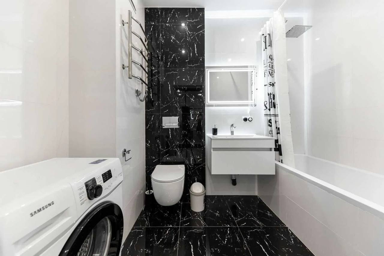 В квартире также имеется отдельная полностью оборудованная кухня с современной бытовой техникой. Ванная комната и туалет выполнены в современном стиле и оборудованы всем необходимым.