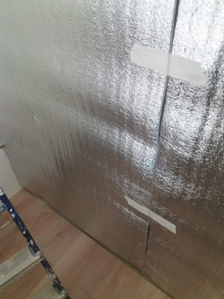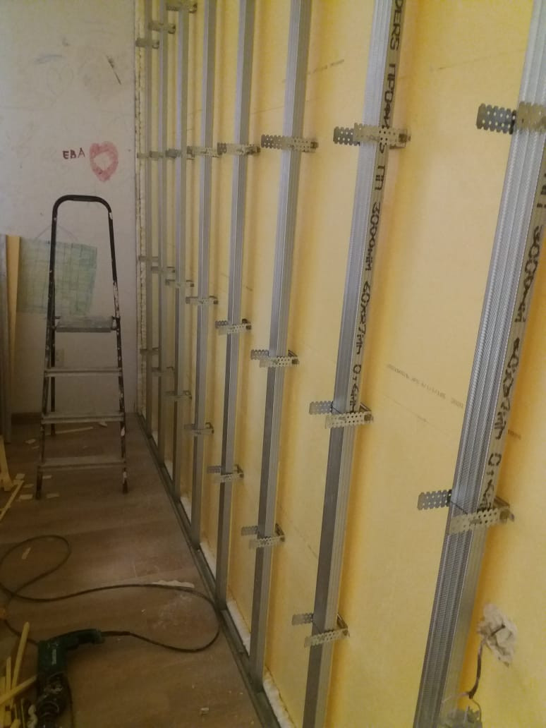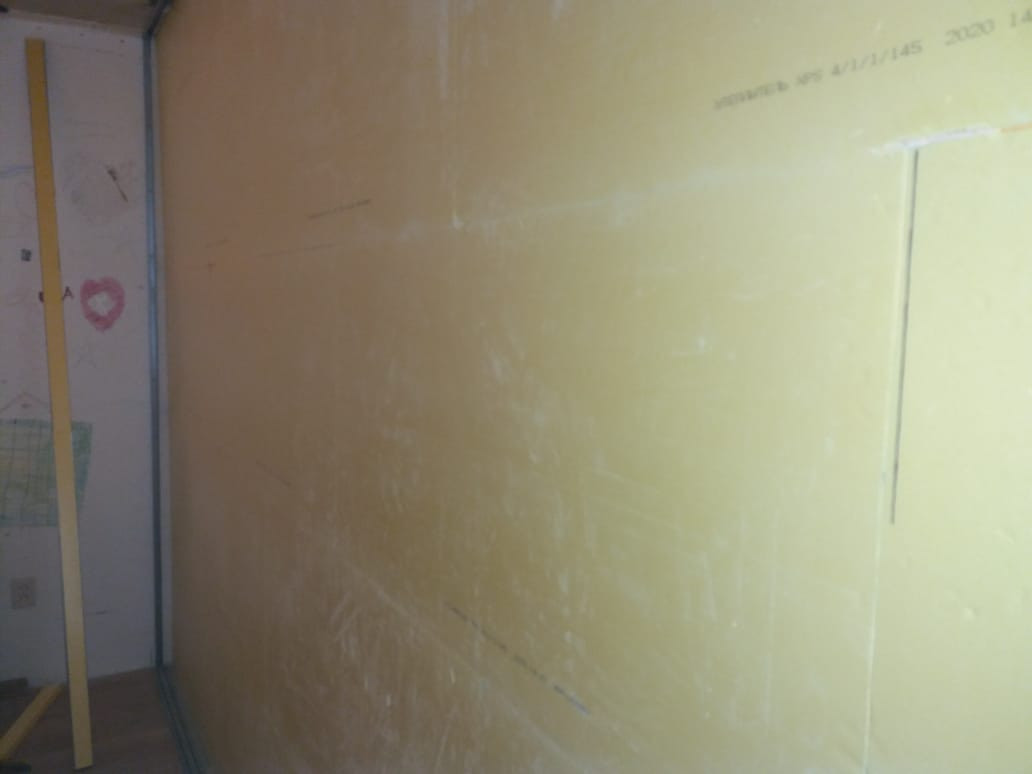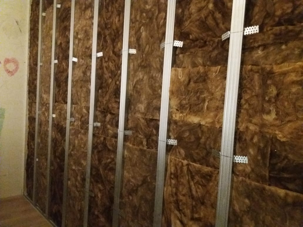 Шумоизоляция в комнате по стене (4 слоя разных материалов, есть на фото)