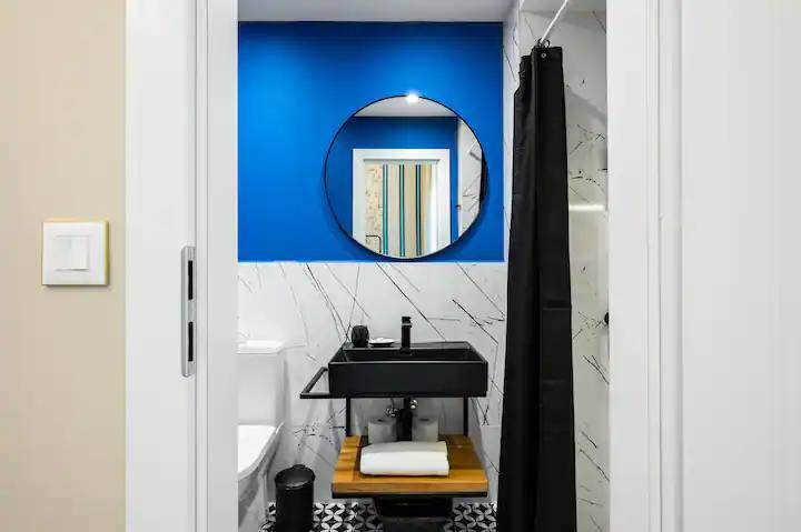 Квартира оформлена современным дизайном. Безупречно обустроенная ванная комната с современными сантехническими удобствами, включая душевую кабину и умывальник.