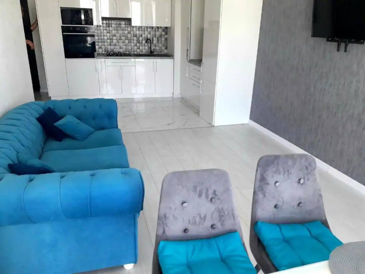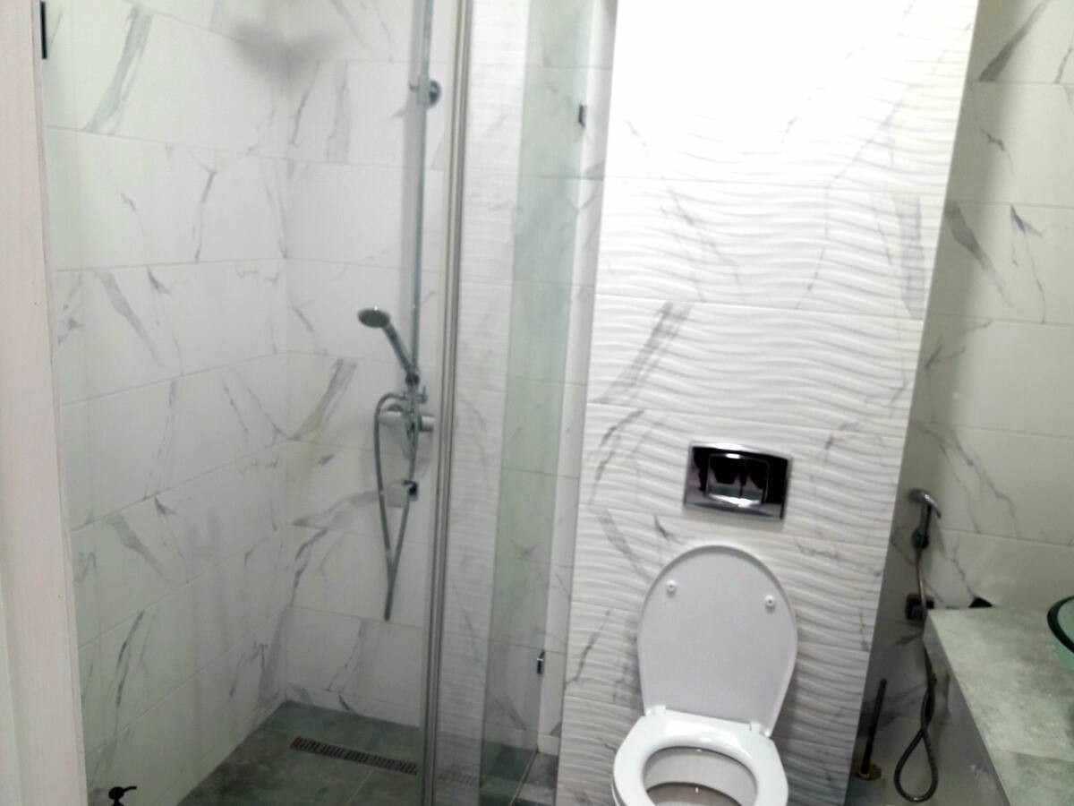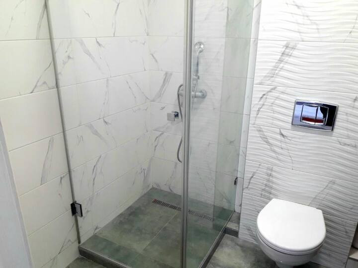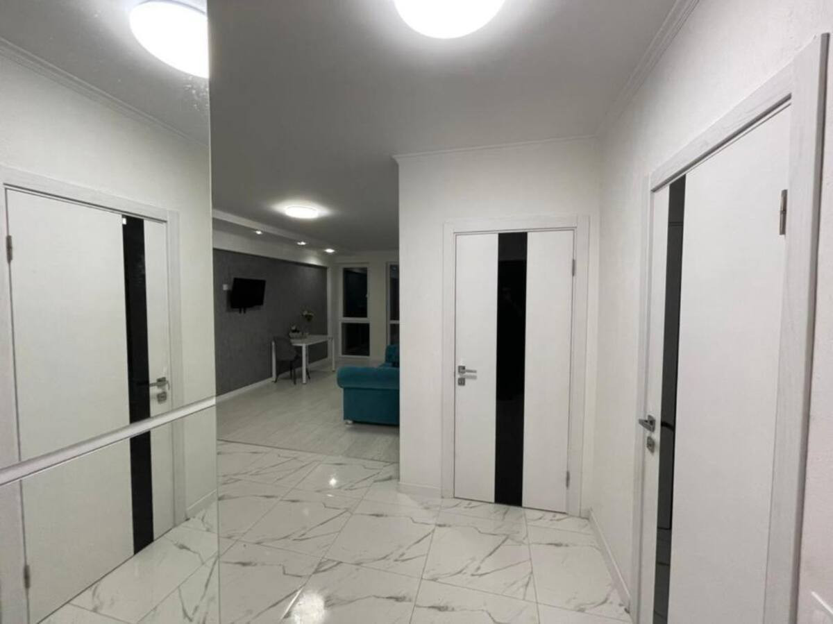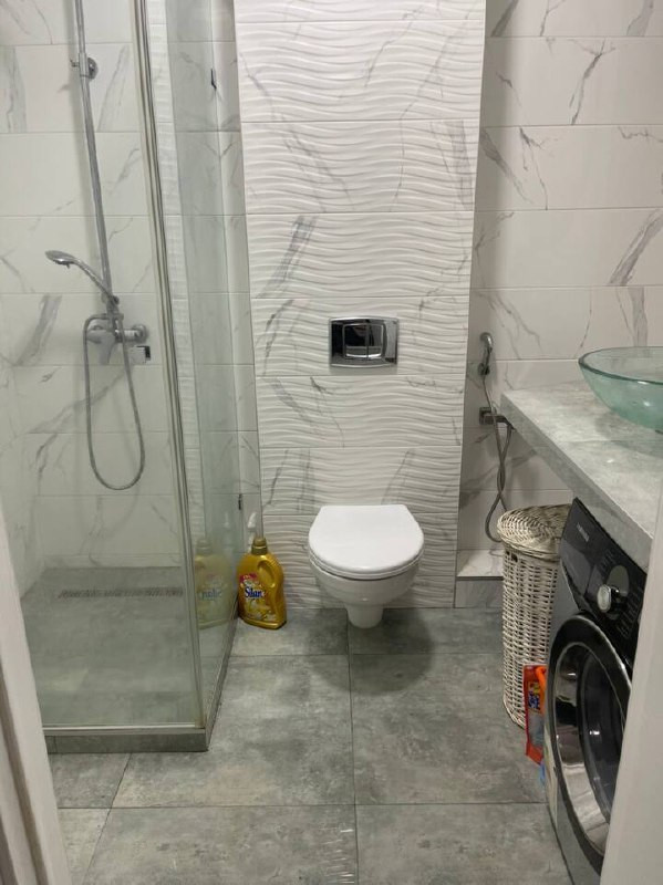 Квартира оформлена современным дизайном. Безупречно обустроенная ванная комната с современными сантехническими удобствами, включая душевую кабину и умывальник.