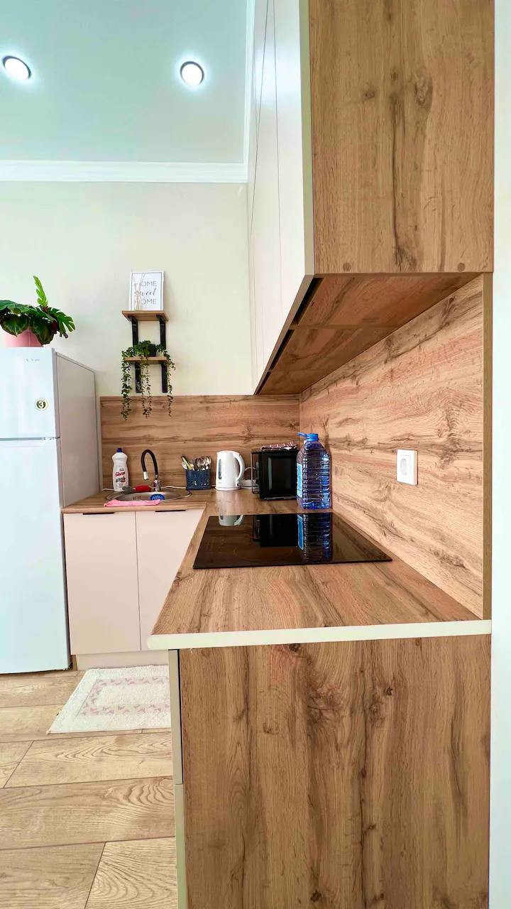 Кухня оборудована всем необходимым оборудованием и имеет достаточно места для приготовления пищи. В гостиной имеется комфортная зона отдыха и ещё место для обеденного стола. Ванная комната оснащена современным сантехническим оборудованием и имеет просторную ванну.