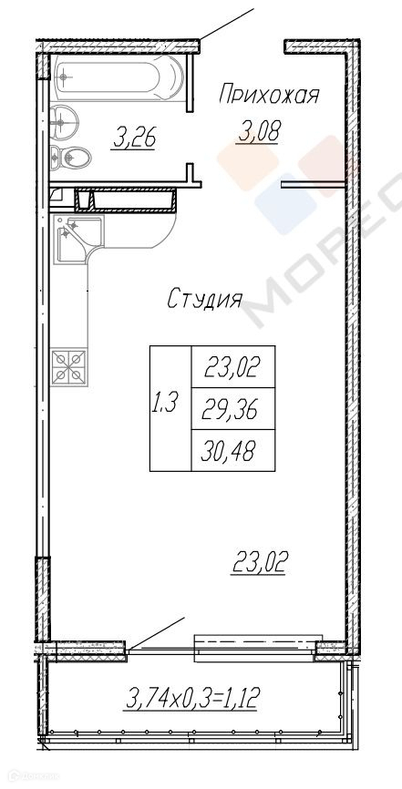 В данном варианте - это квартира-студия площадью 30,48 м2., в монолитном доме с современной архитектурой, скоростными лифтами и подземным паркингом.