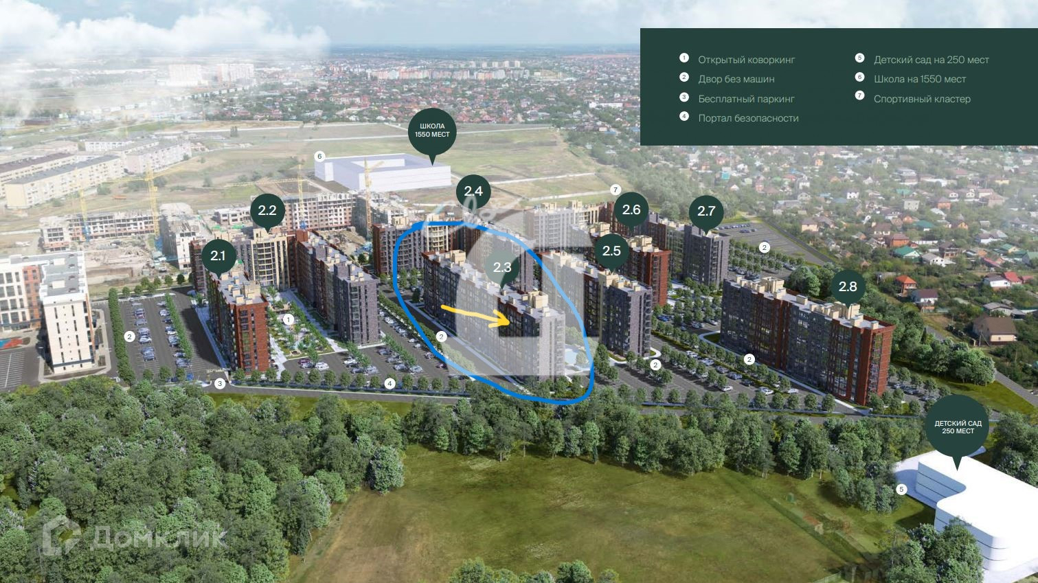 Своя площадка для выгула животных, спортивные площадки, открытый коворкинг, двор без машин, бесплатная наземная парковка, игровые экоплощадки, прогулочные локации, зоны отдыха для взрослых и детей.