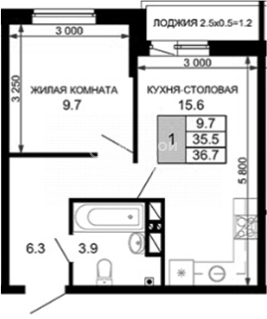 Общая площадь 36.7 м2