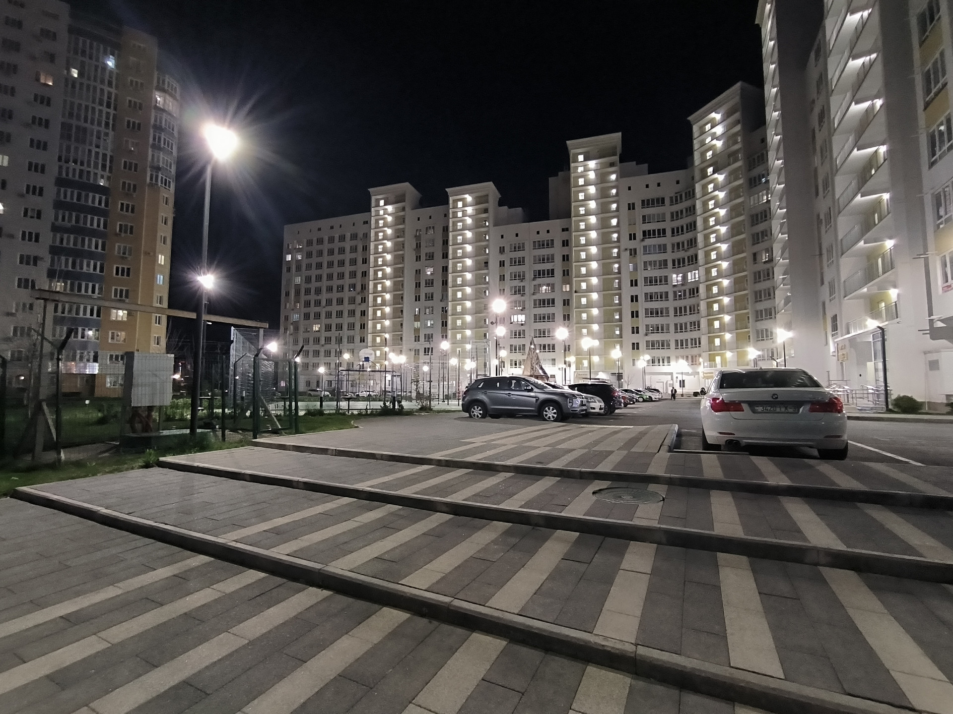 Уютная просторная придомовая территория с множеством парковочных мест.