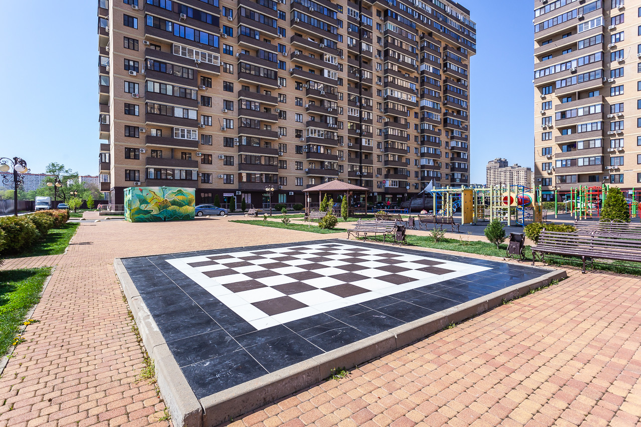 Большой наземный паркинг у дома, красивая придомовая территория с зелеными насаждениями. Качественные детские и спортивные площадки, теннисный корт, свежий воздух и тишина вдали от магистралей, близость реки Кубань позволят с пользой и удовольствием провести время на свежем воздухе.