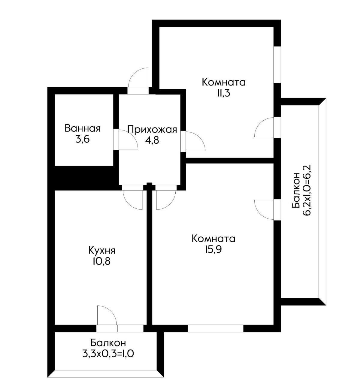 Две большие изолированные комнаты 15.9 и 11.3м2. Просторная кухня 10.8м2 и два  балкона, на один из которых на две комнаты и отдельный балкон на кухне.