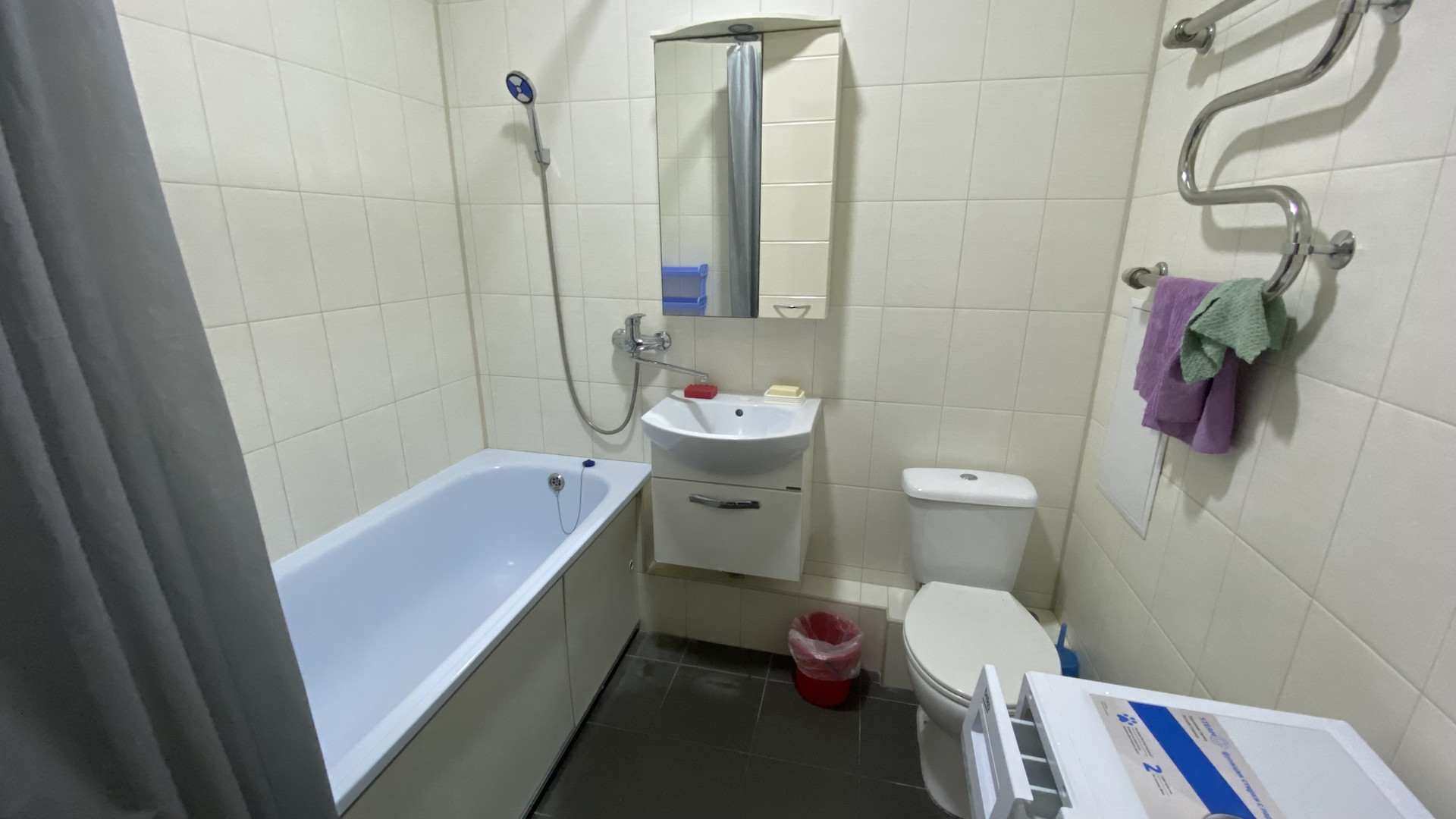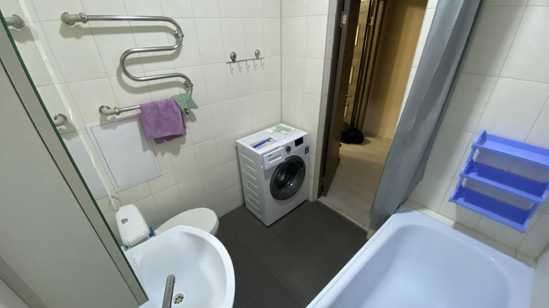 * Ванная комната с кафельными стенами и полом, стиральной машиной и полотенце-сушителем.