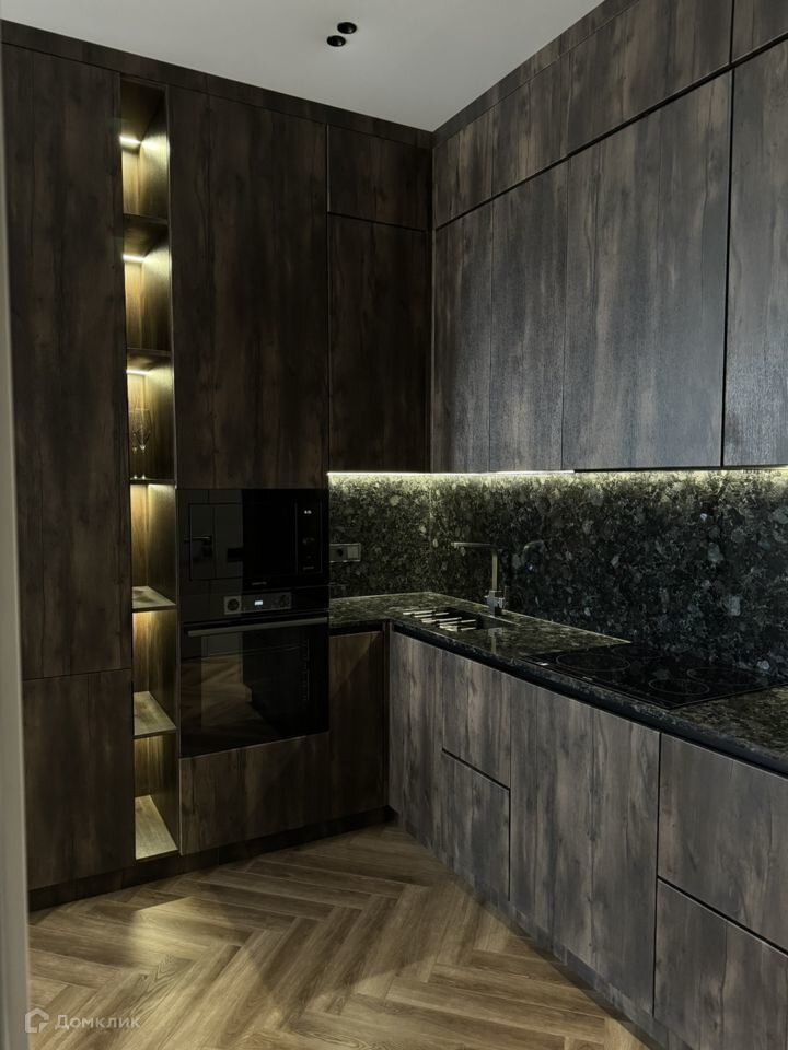В квартире большая кухня-гостиная. Установлена мебель и техника