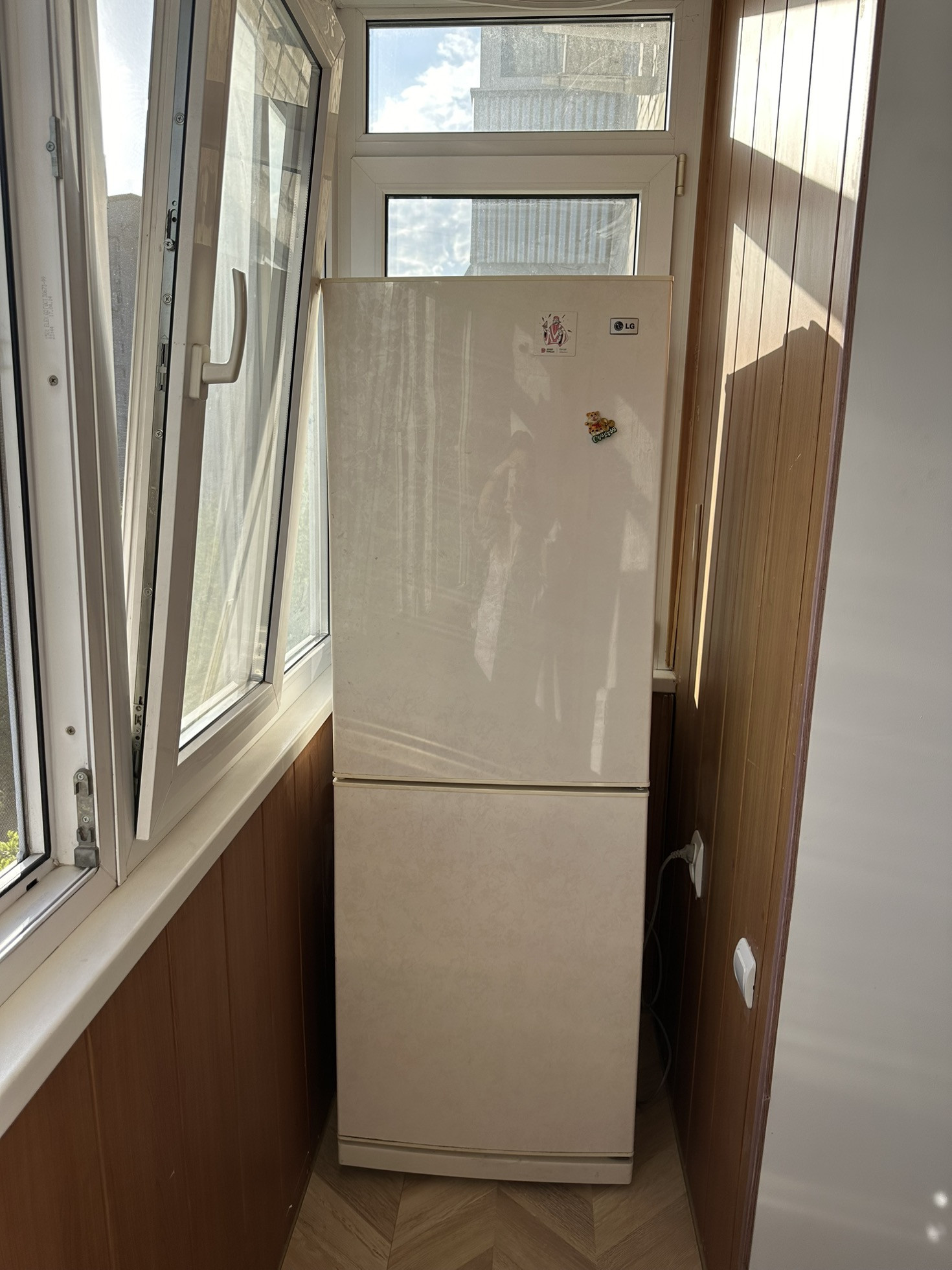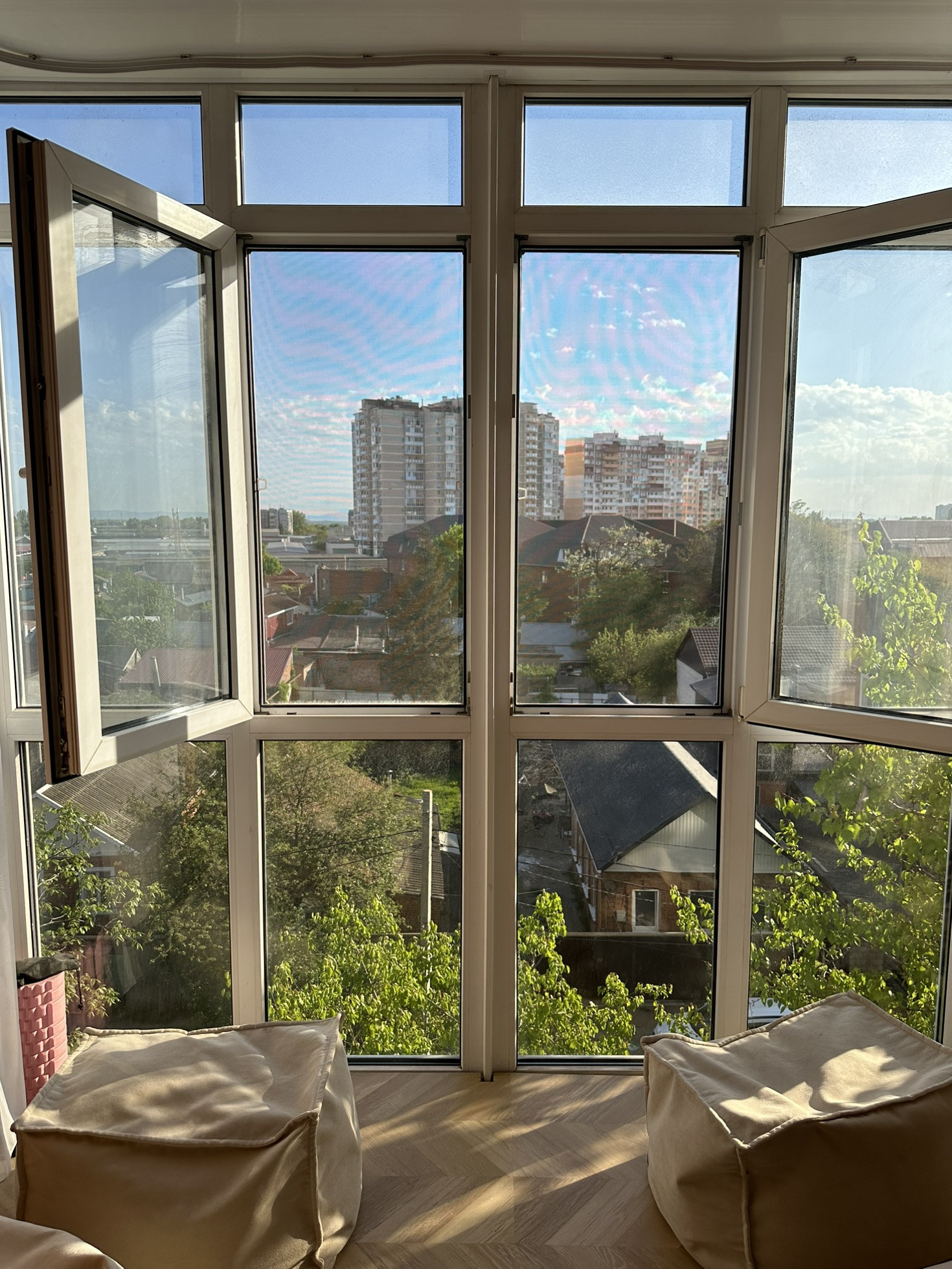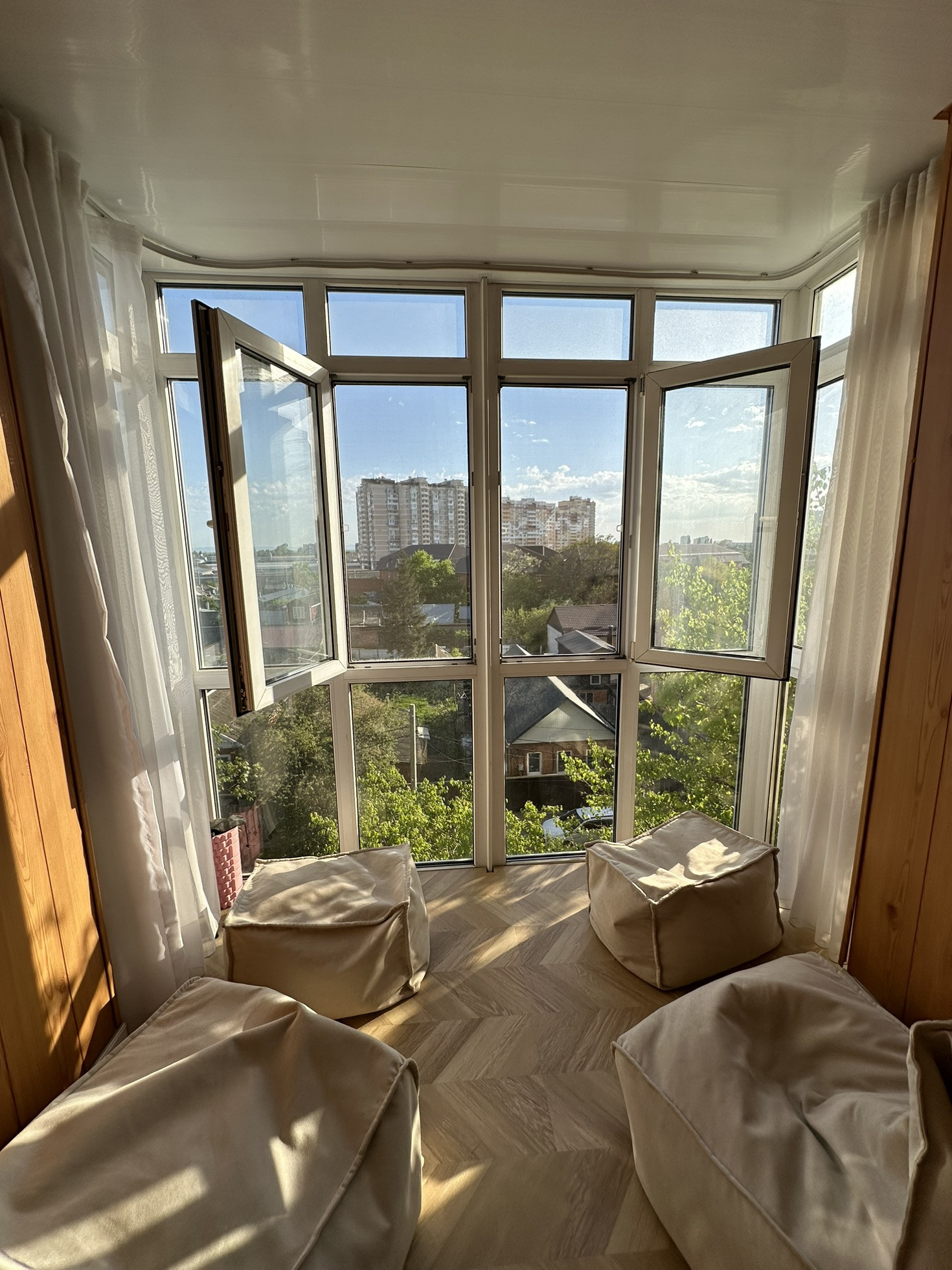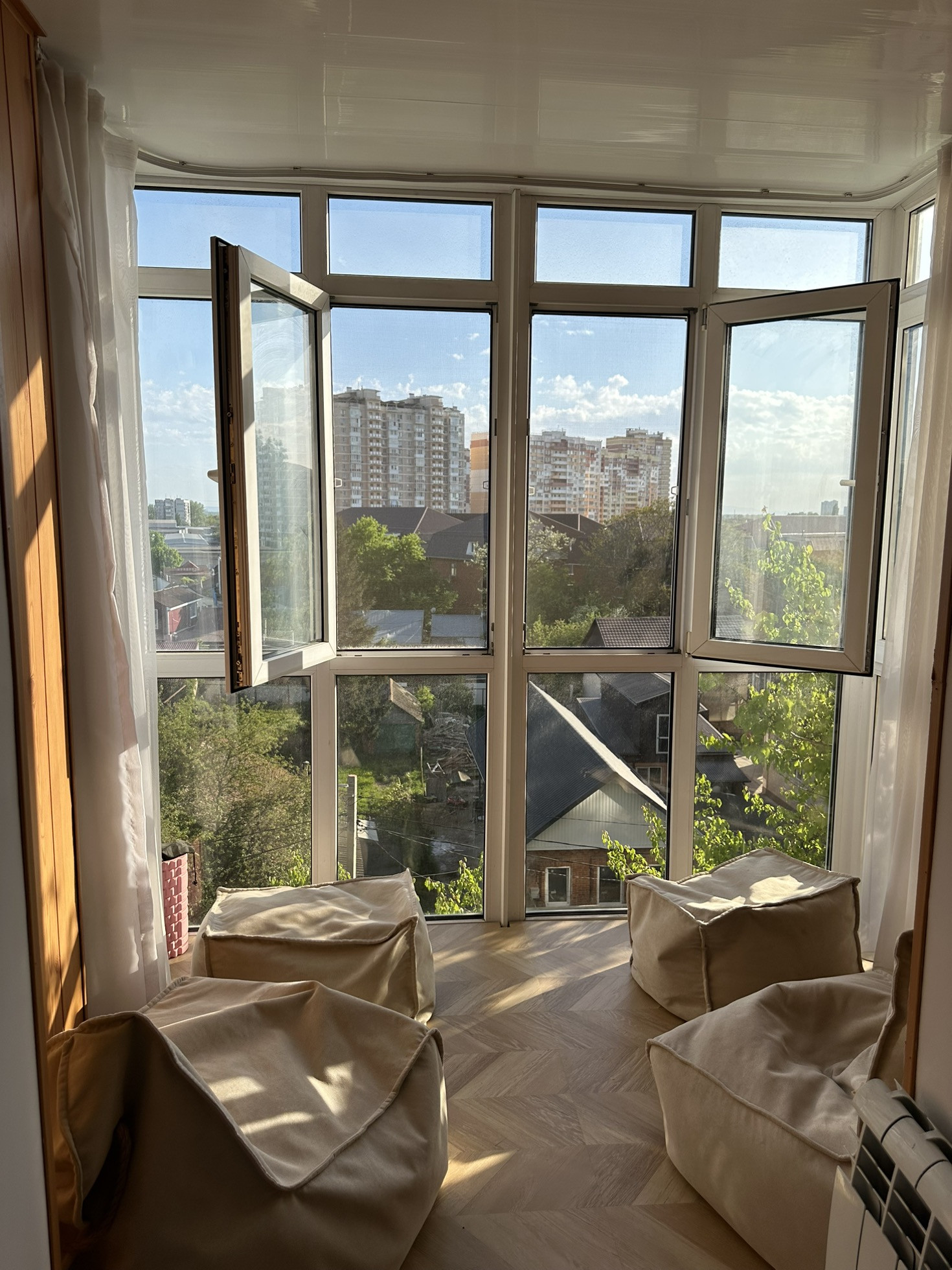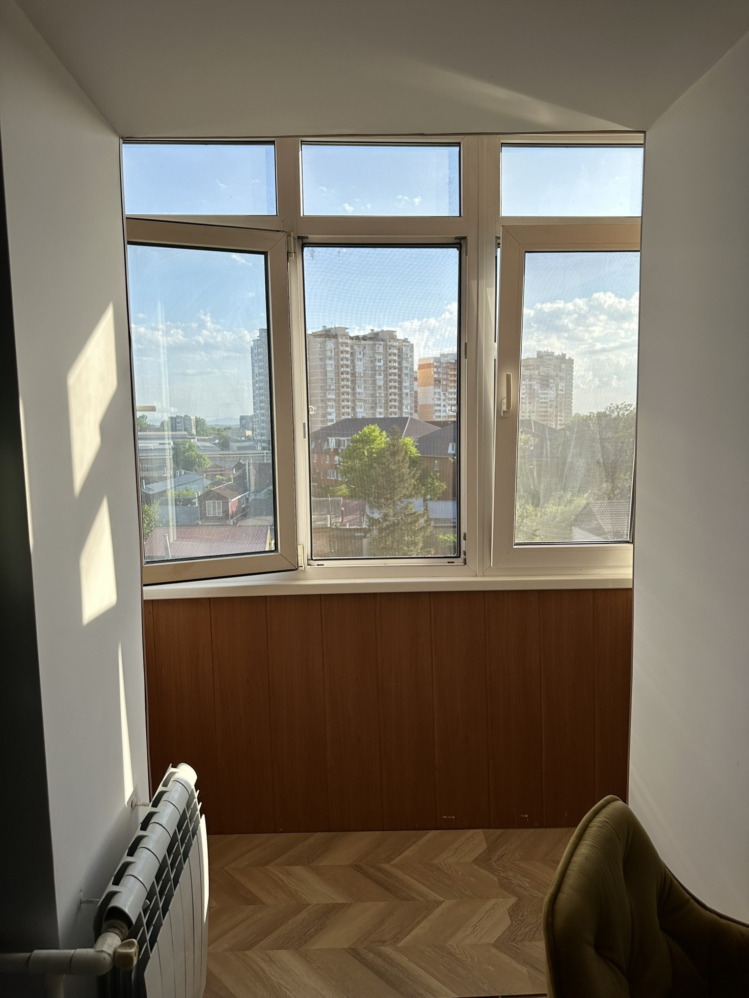 В квартире большой балкон с панорамными окнами.