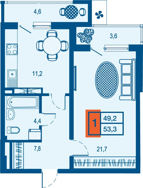 Жилая площадь 21.7 м2