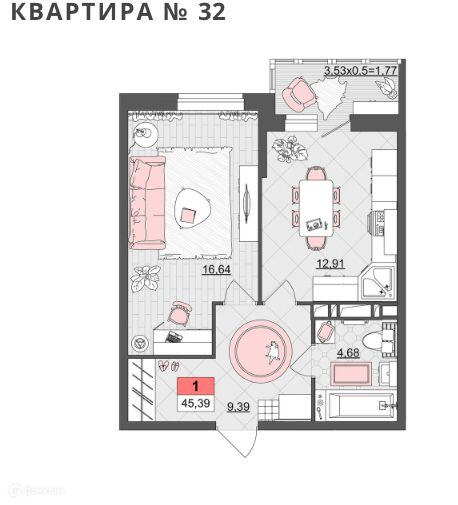 Общая площадь 45.39 м2