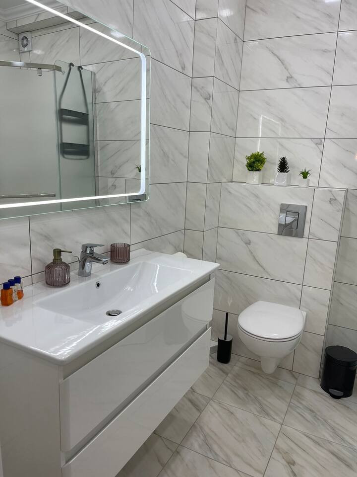 Общая площадь квартиры составляет 65.60 кв.м.Квартира оформлена современным дизайном. Безупречно обустроенная ванная комната с современными сантехническими удобствами, включая душевую кабину и умывальник.
