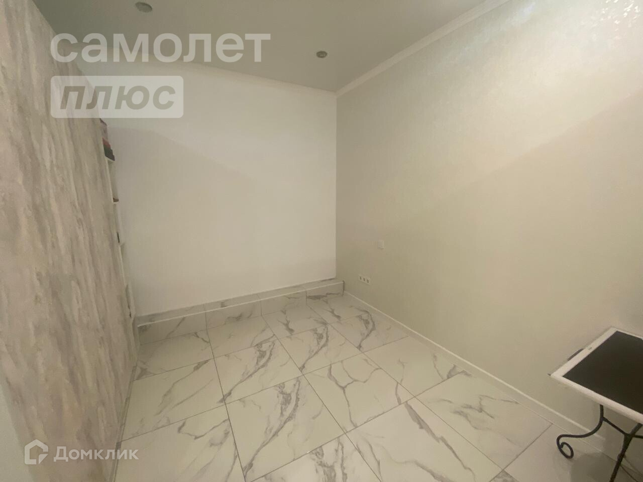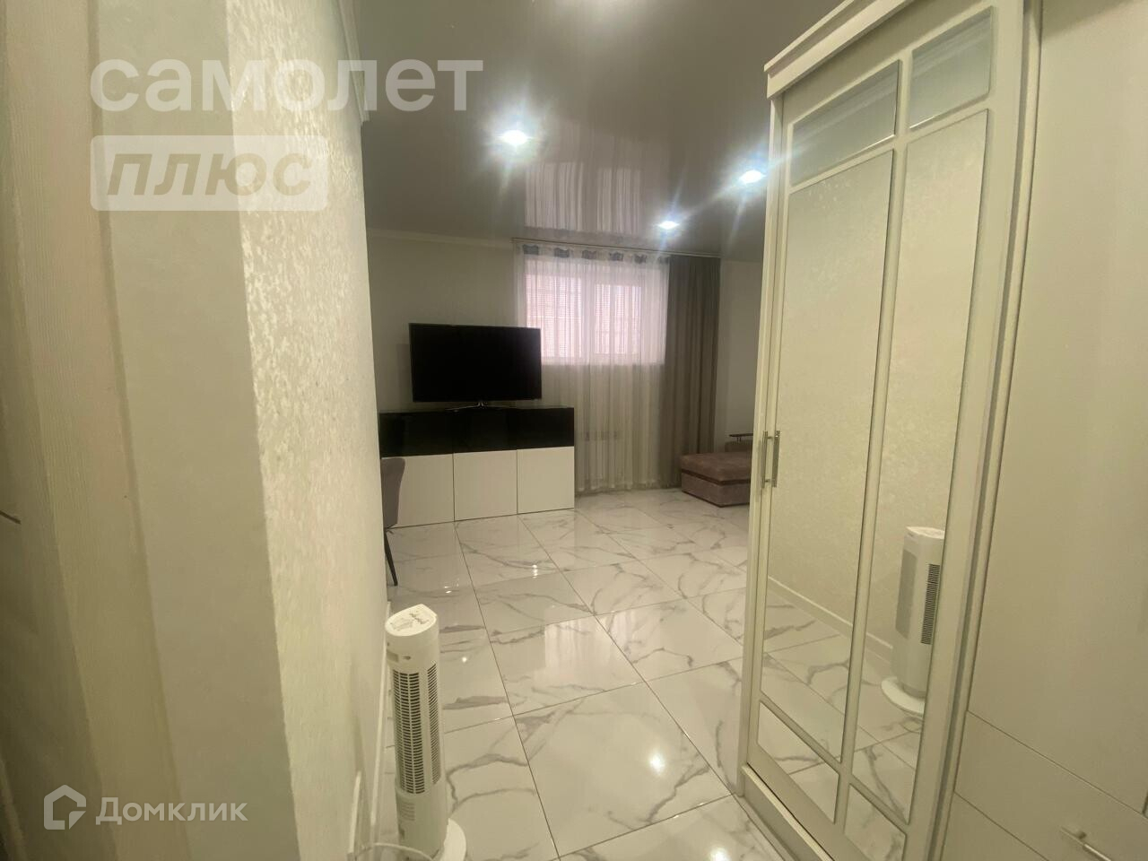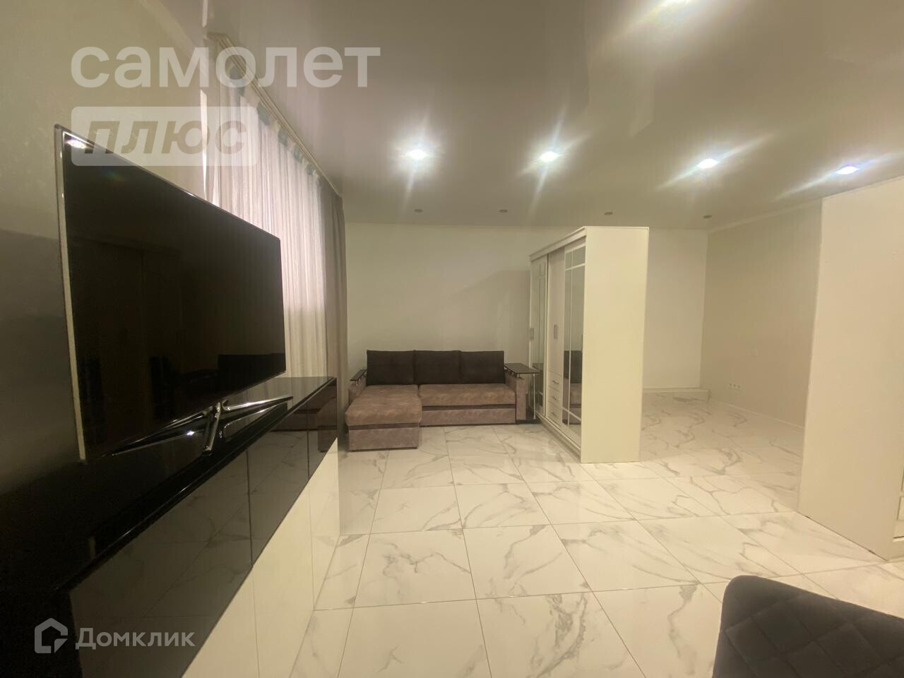 Напольное покрытие керамогранит(теплый пол), натяжные потолки во всей квартире.