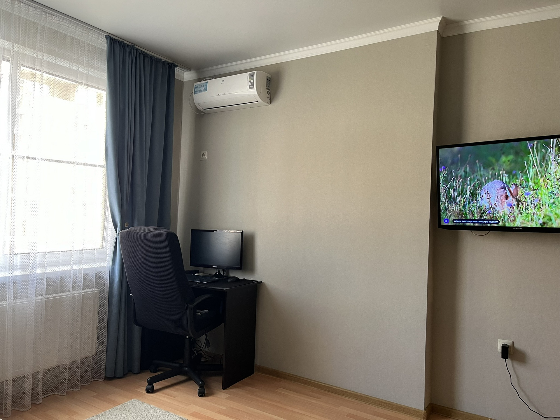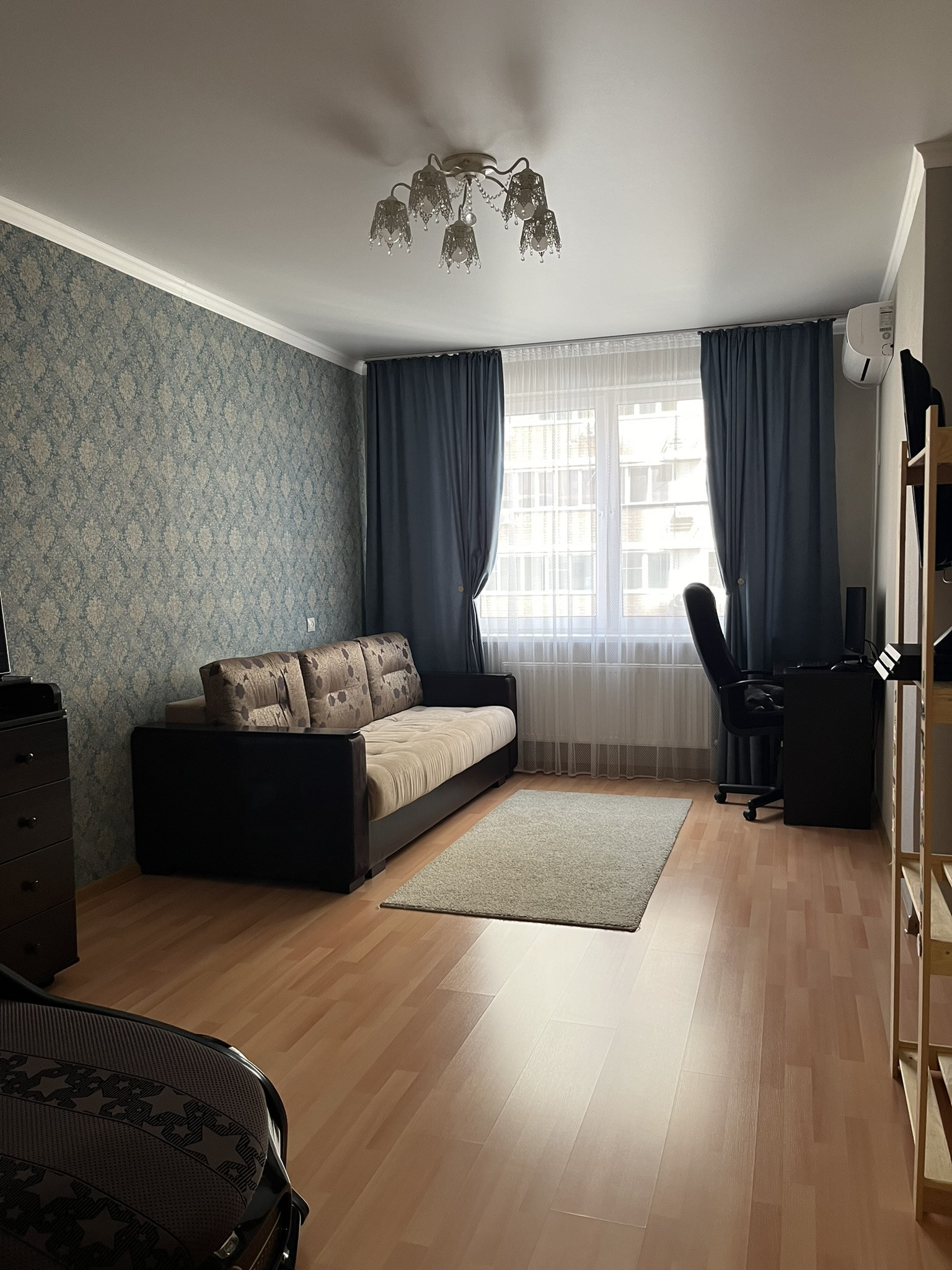 1. Комната - кондиционер, большое спальное место (оно же диван, на фото он в собранном виде), детская кровать (вида мерседес), комод с 5 ящиками и складным пеленальным столиком, стол под ПК (дешевый и маленький), стеллаж, кронштейн под телевизор, люстра.