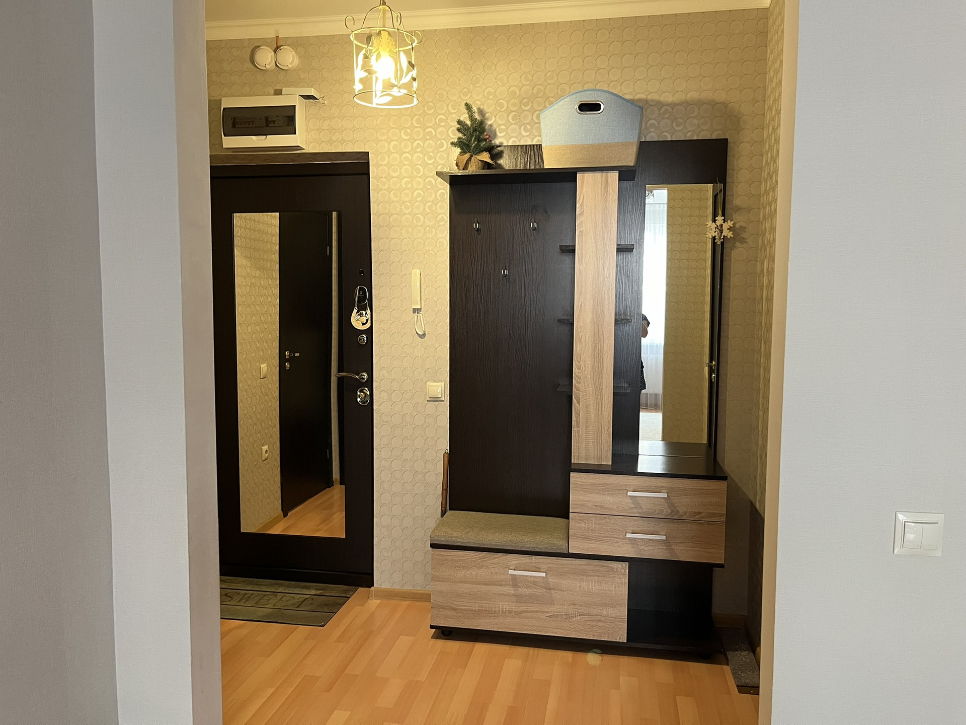 2. Прихожая - остается мебель прихожая (на фото),люстра, входная дверь НЕ ОТ застройщика, с ростовым встроенным зеркалом.
