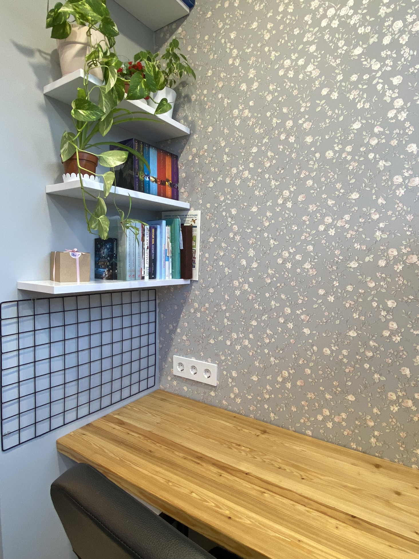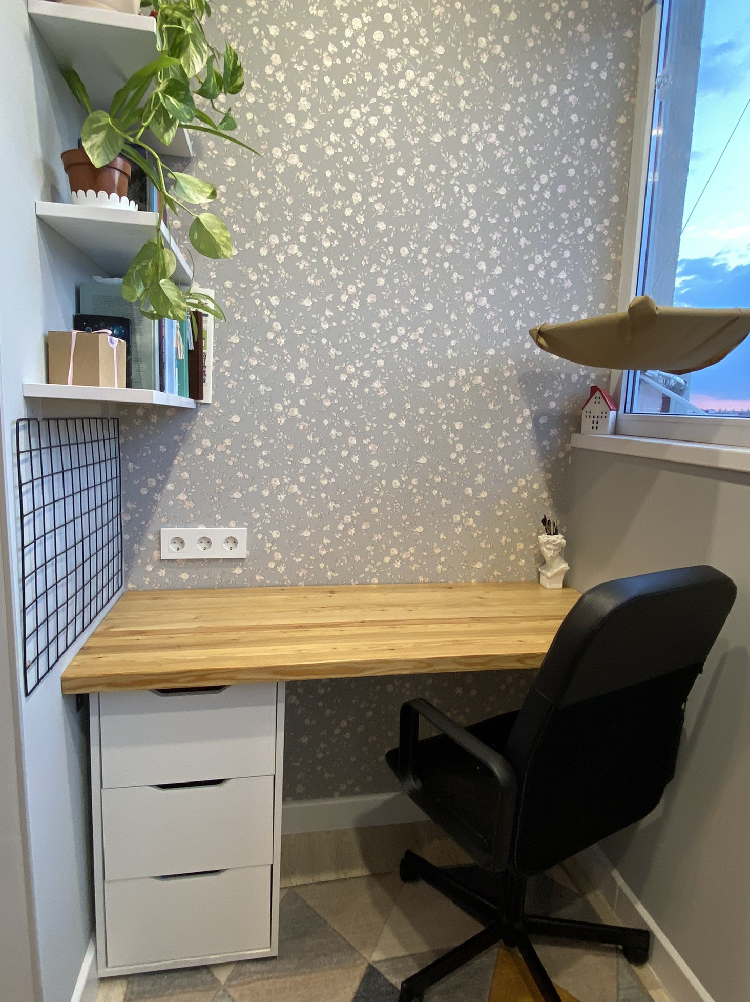 Лоджия утеплена, там сделан ремонт и оборудовано 2 рабочих места с деревянными столешницами.