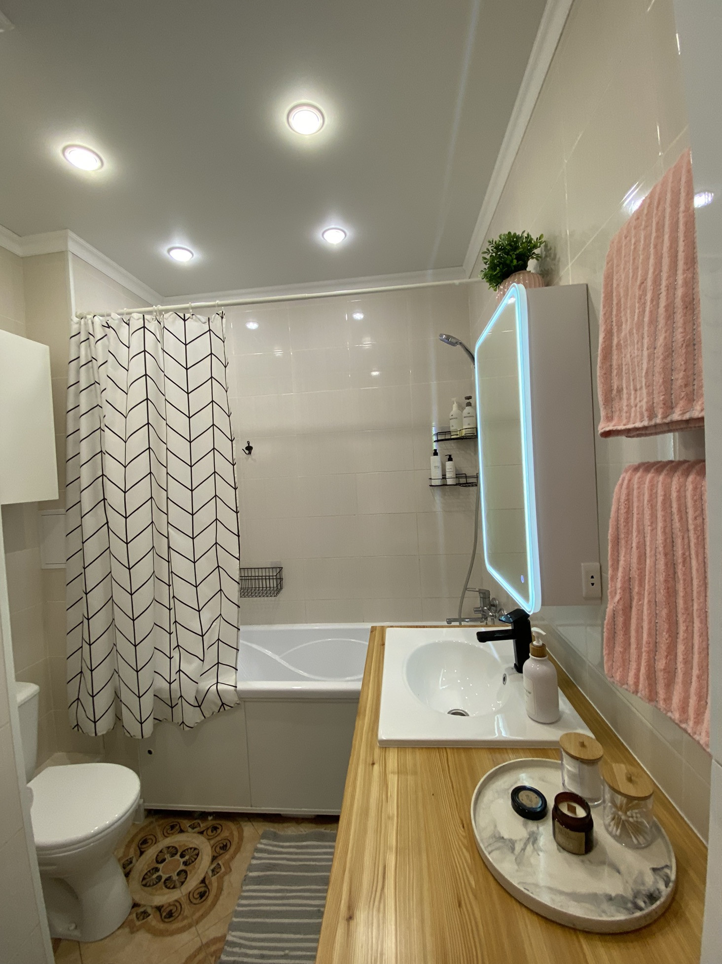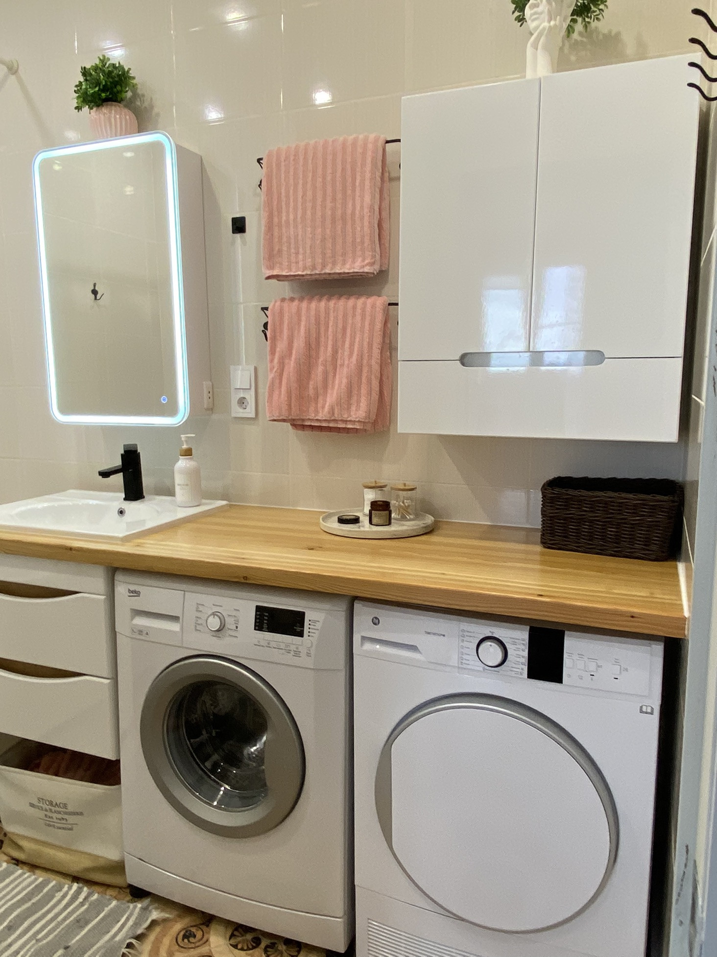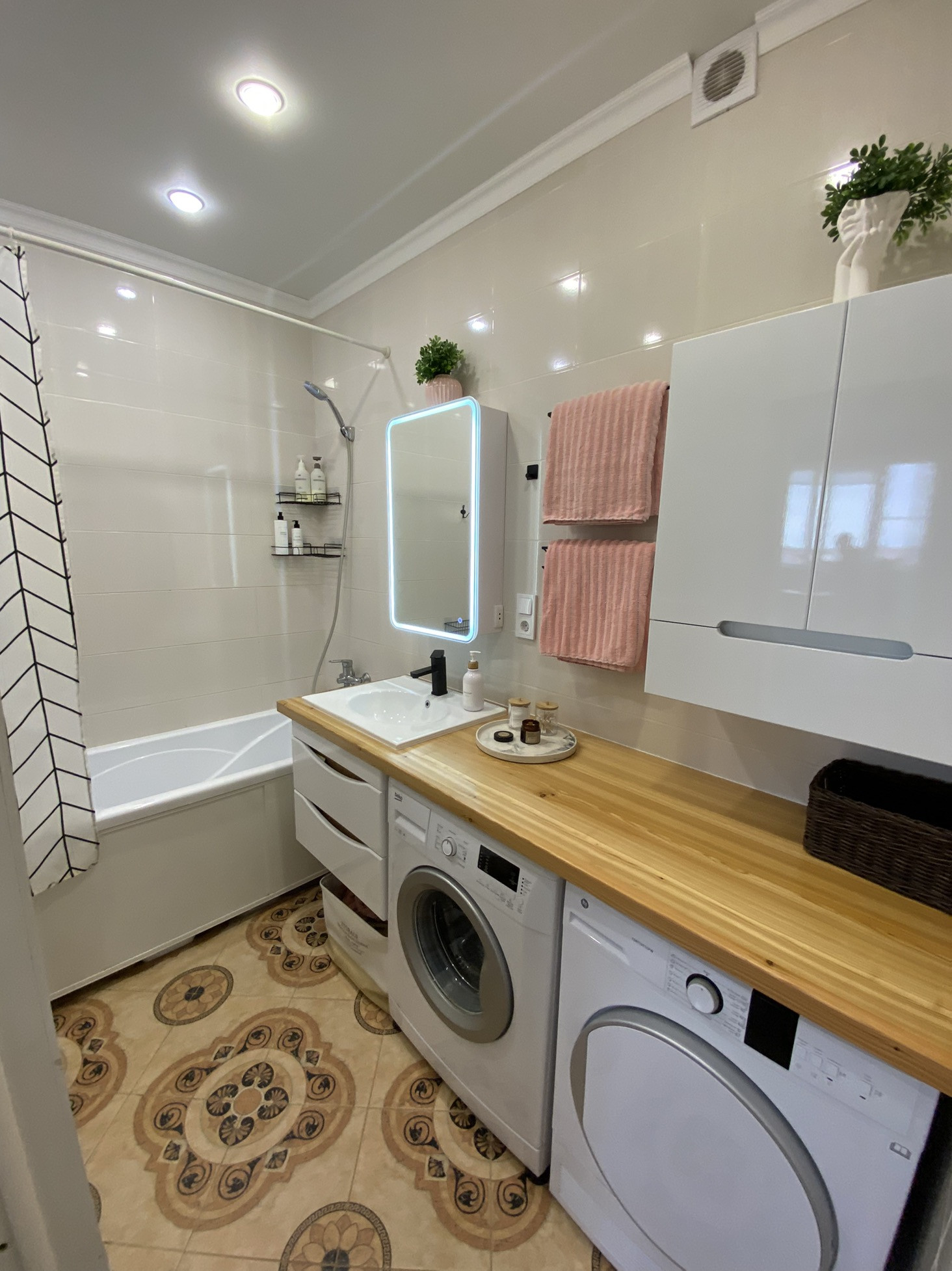 Ванна 5 кв.м, столешница длинной 2 м из натурального дерева.