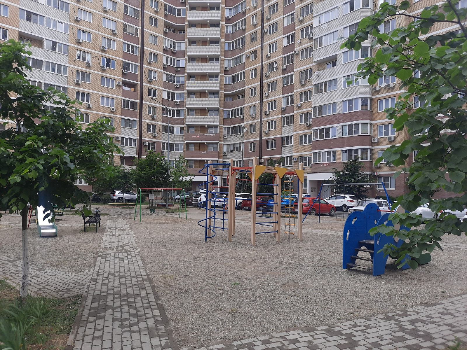 Территория дома с детской площадкой и большим количеством парковочных мест.
