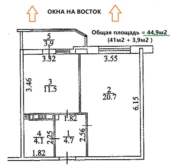 •    Общая площадь почти 45м2 (41м2 по выписке + 3,9м2 лоджия) – это самая крупная планировка среди однокомнатных квартир.