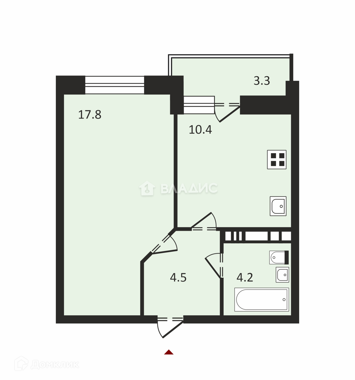 Площадь комнаты 17,8 кв.м , площадь кухни 10,4 кв.м., санузел 4,2 кв.м.
