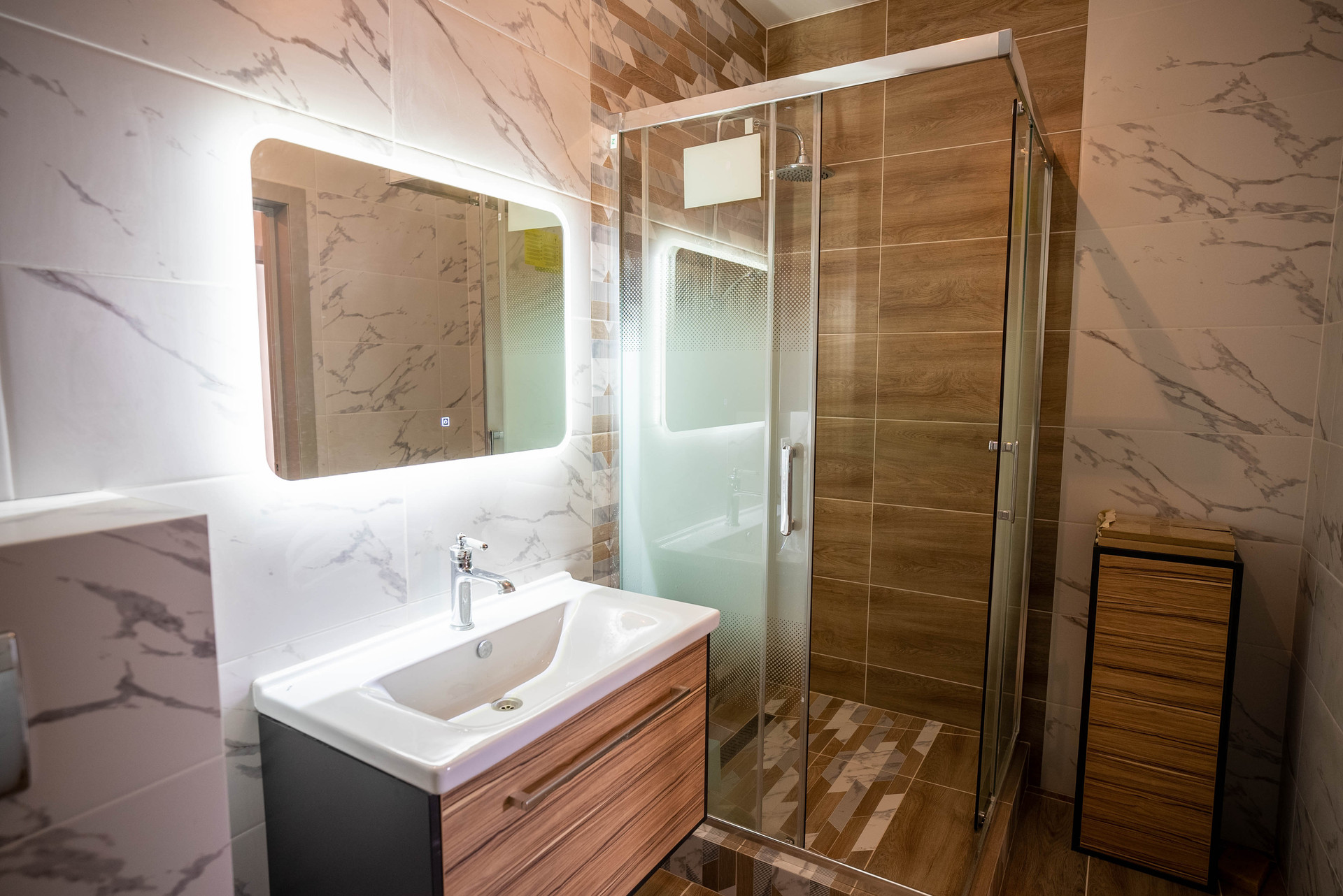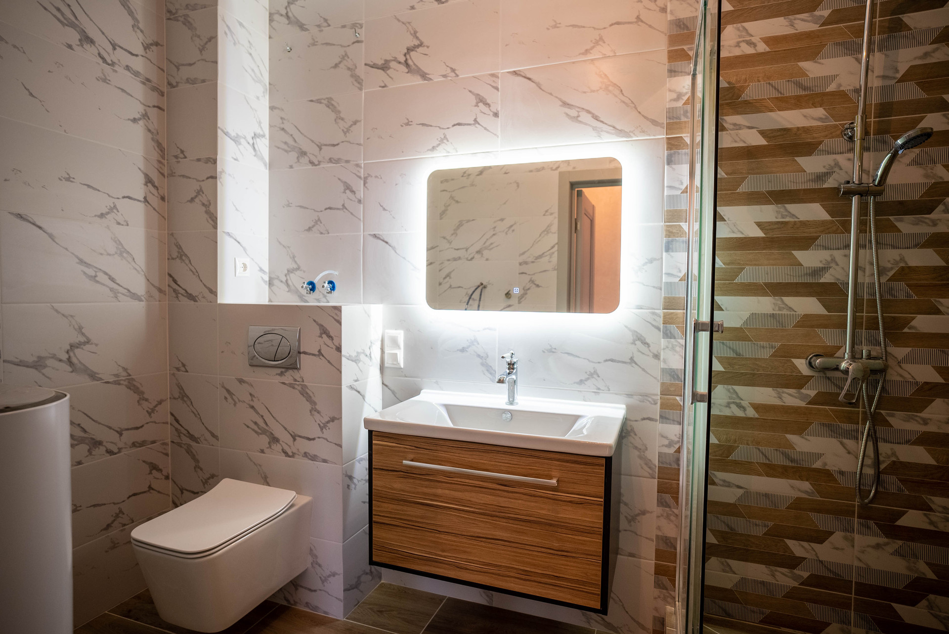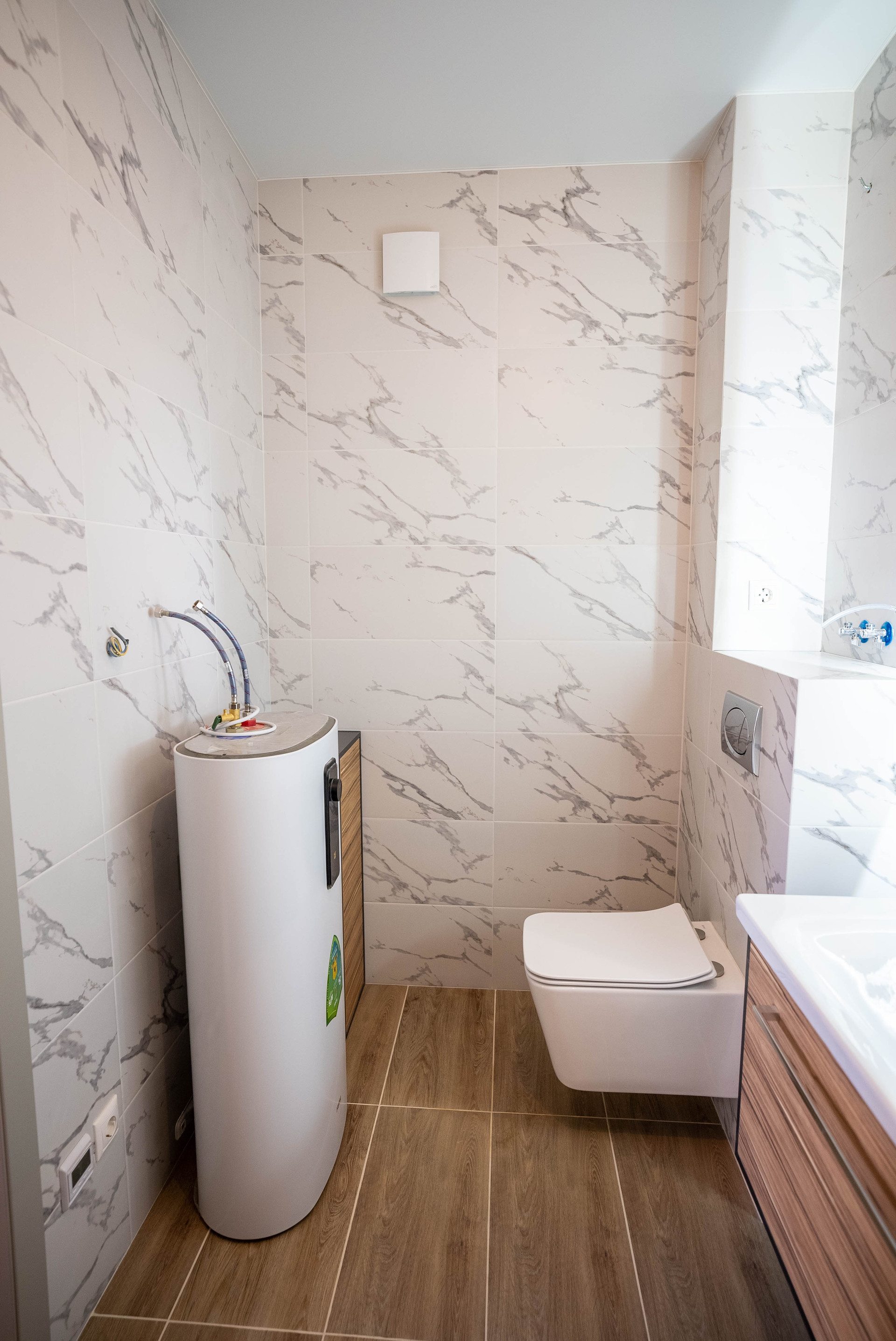• санузел совмещен - 5.5м2: теплые полы + бойлер на 80 литров, качественная сантехника, тумбы хранения, возведенная душевая кабина, инсталляция, вывод для полотенцесушителя,